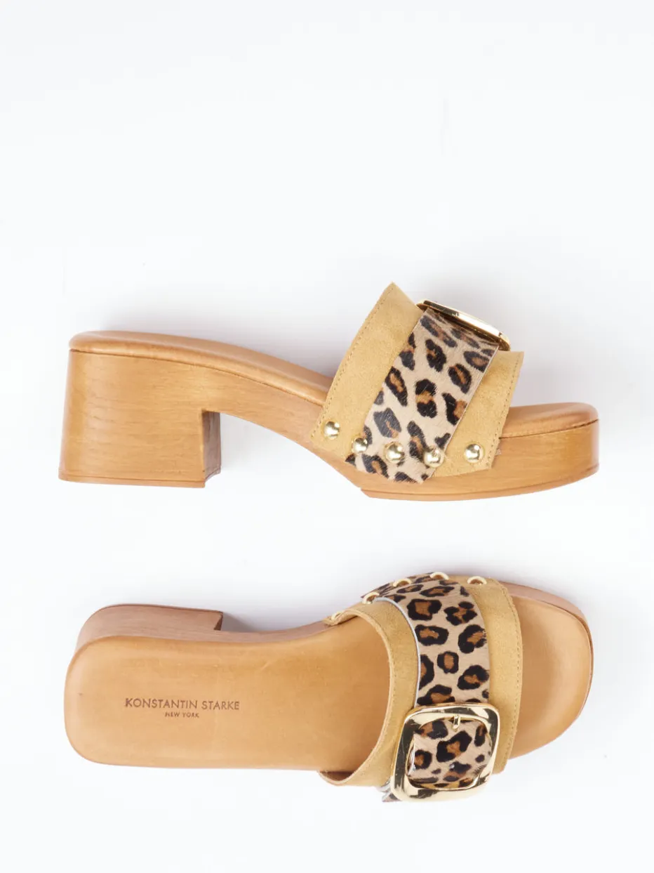 Boho-Glamour im Retro-Stil.Konstantin Starke präsentiert modisch markante Plateau-Mules für Damen. Ideal für sommerliche Freizeitmomente und ausgehfreudige Anlässe bieten diese Mules dank kräftigem Holzabsatz, gepolstertem Glattleder-Fußbett und offener Schlupfform überzeugenden Komfort. Der breite, ockerbraune Velourslederriemen – samtig genarbt – trifft auf einen Ponyfell-Überwurf im angesagten Leoprint. Goldfarbene Ziernieten und eine große Schnalle unterstreichen die trendige Boho-Ästhetik. Der Vintage-Einfluss der 70er verleiht ihnen expressive Nonchalance. Statement-Piece für Fashion-Looks mit Charakter und Retro-Flair.