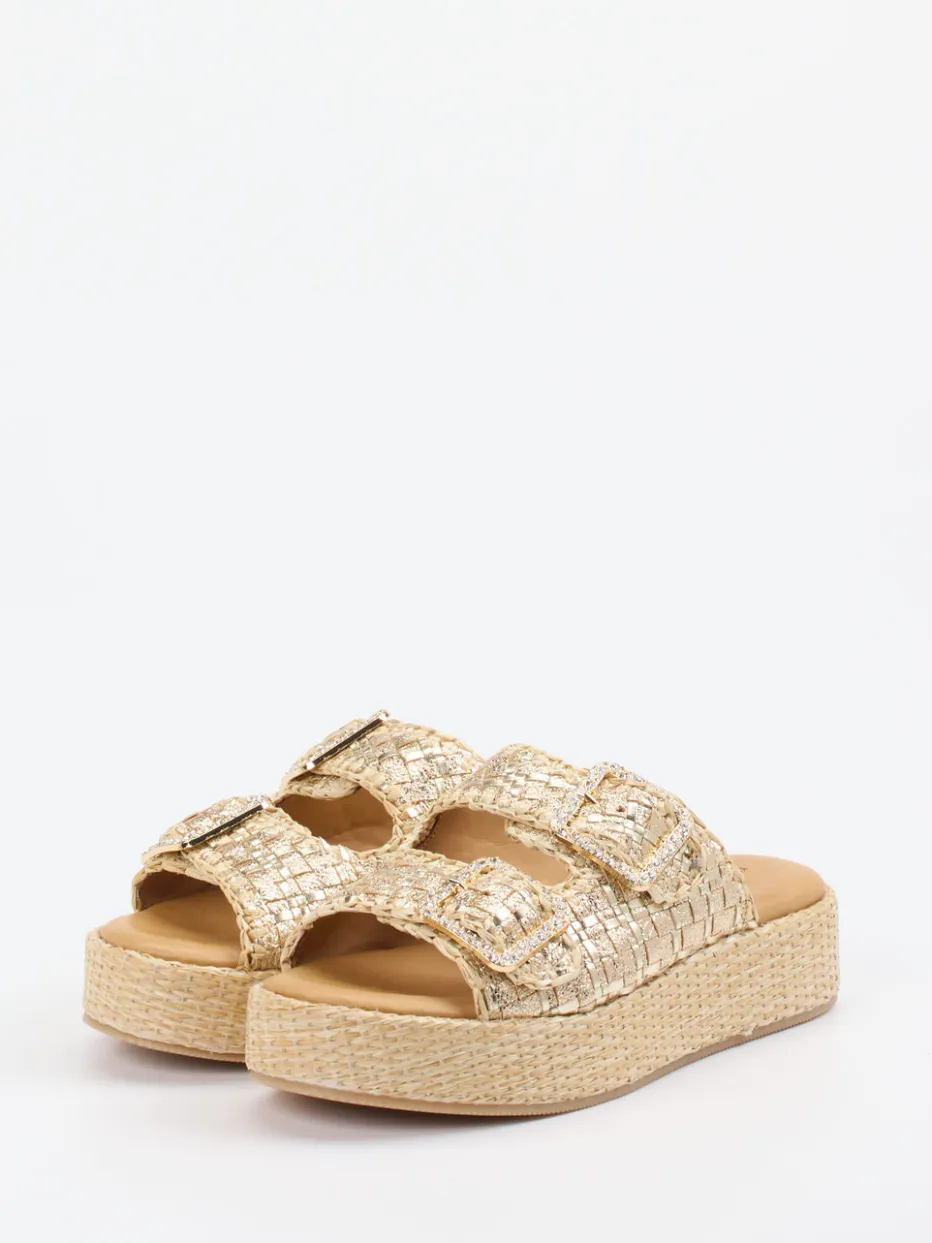 Die sommerliche Plateau-Pantolette vereint weich geflochtenes Leder mit funkelnden Metallic-Details – perfekt im Einklang mit aktuellen Boho- und Resortwear-Trends.