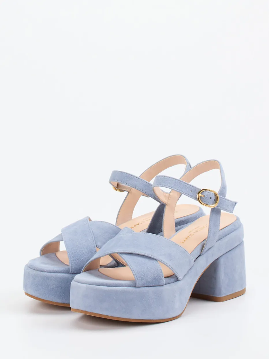 Plateau-Sandalen von Konstantin Starke verbinden sommerliche Farbnuancen mit Vintage-Flair. Ideal für urbane Sommertage oder abendliche Anlässe: Das butterweiche Veloursleder in Hellblau zeigt eine matte Oberfläche und betont mit gekreuzten Riemen den 70er-Jahre-Look. Ein goldfarbener Schnallenverschluss am Knöchelriemen sorgt für verlässlichen Halt, während der 6 cm hohe Blockabsatz mit 3 cm Plateau Laufkomfort und modischen Appeal vereint. Das innenliegende Kalblederfutter in Nude unterstreicht die ausgezeichnete Verarbeitung. Besonders gefragt im Soft-Pastel-Trend der Saison. Designstärke in Farbe, Form und Komfort vereint – Konstantin Starke steht für stilbewusste Leichtigkeit.