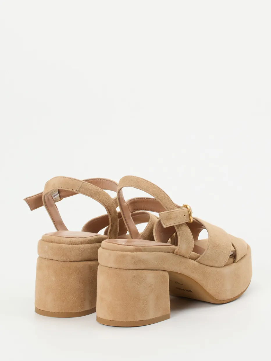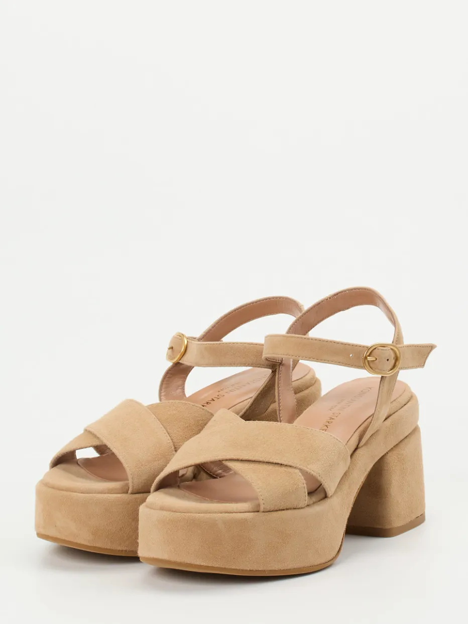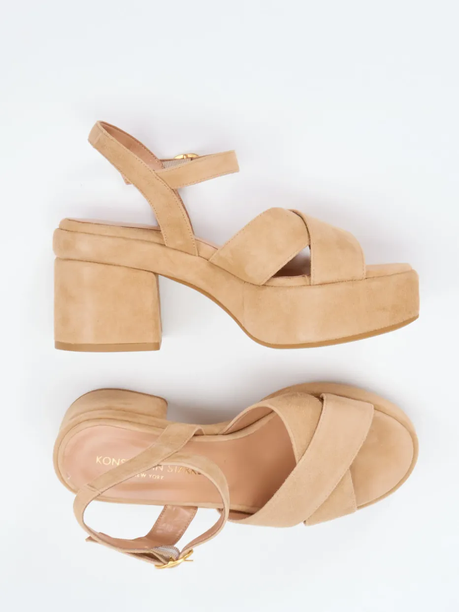 Stil im Zeichen der 70er.Die Marke Konstantin Starke zeigt mit dieser Damen-Plateausandale, wie Retro-Charme modern interpretiert werden kann. Ob Stadtbummel oder Sundowner-Event – das butterweiche Veloursleder in hellem Beige und die blockförmige Silhouette mit 6 cm Absatz und 3 cm Plateau bieten stilvollen Komfort. Optisches Highlight sind gekreuzte Riemen am Vorderfuß sowie die verstellbare, goldfarbene Schnalle am Fersenriemen. Das gepolsterte Kalblederfutter sorgt zusätzlich für ein angenehmes Tragegefühl. Inspirierend ist der klare Minimal-Style mit femininer Eleganz. Ein femininer Allrounder für anspruchsvolle Sommerlooks – mit dem typischen Finish von Konstantin Starke.