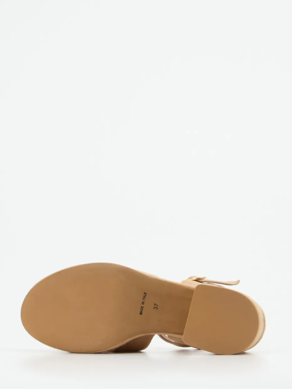 Blockabsatz, weiches Veloursleder und dezente Goldakzente verbinden sich zu einem stilvollen Sommermodell mit hochwertigem Tragekomfort und trendiger Siebzigerjahre-Anmutung.