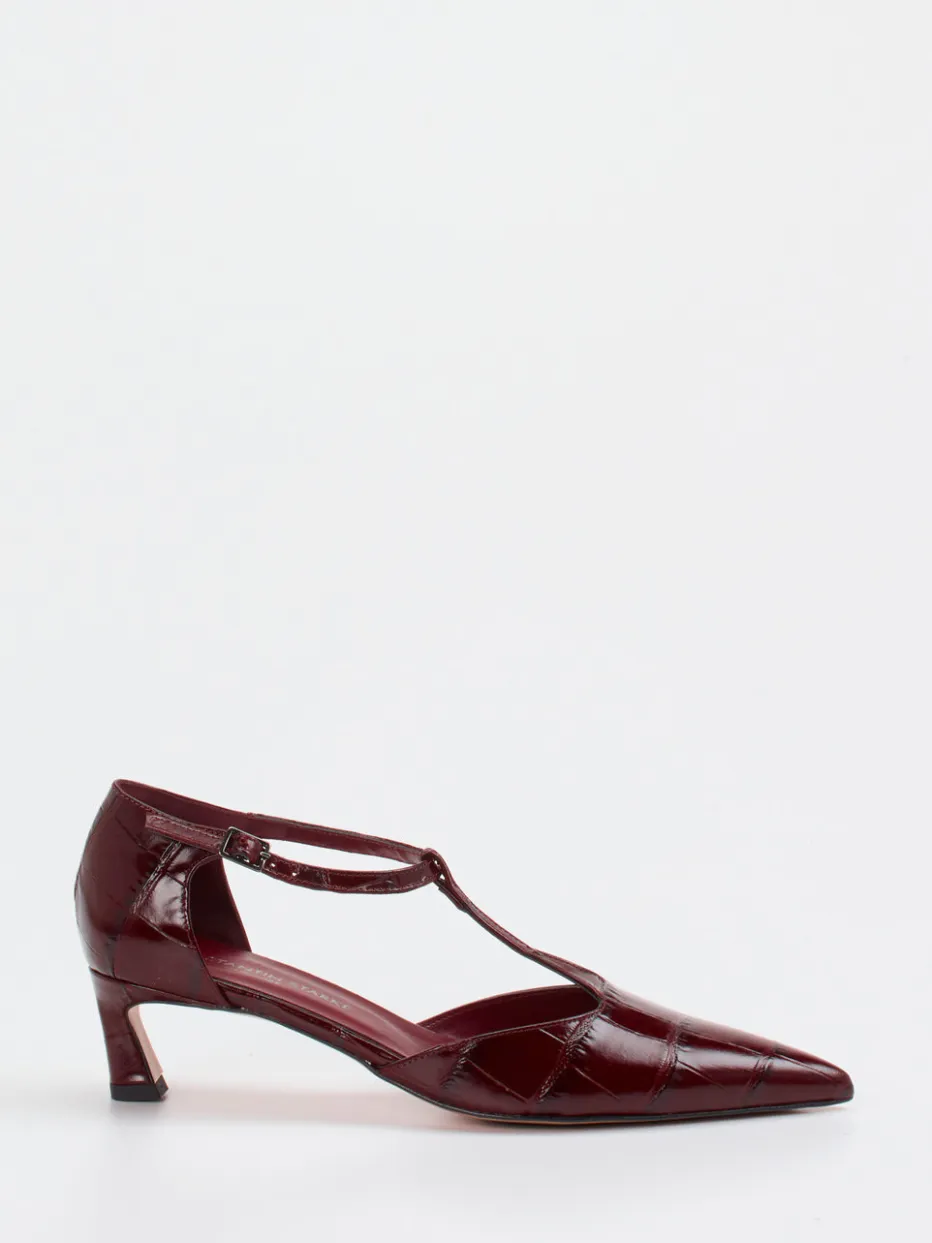 Der T-Riemen und die spitze Silhouette unterstreichen die raffinierte Linie dieser Pumps. Die glänzend geprägte Kroko-Struktur verleiht ihnen zeitlose Eleganz mit trendbewusstem Appeal.