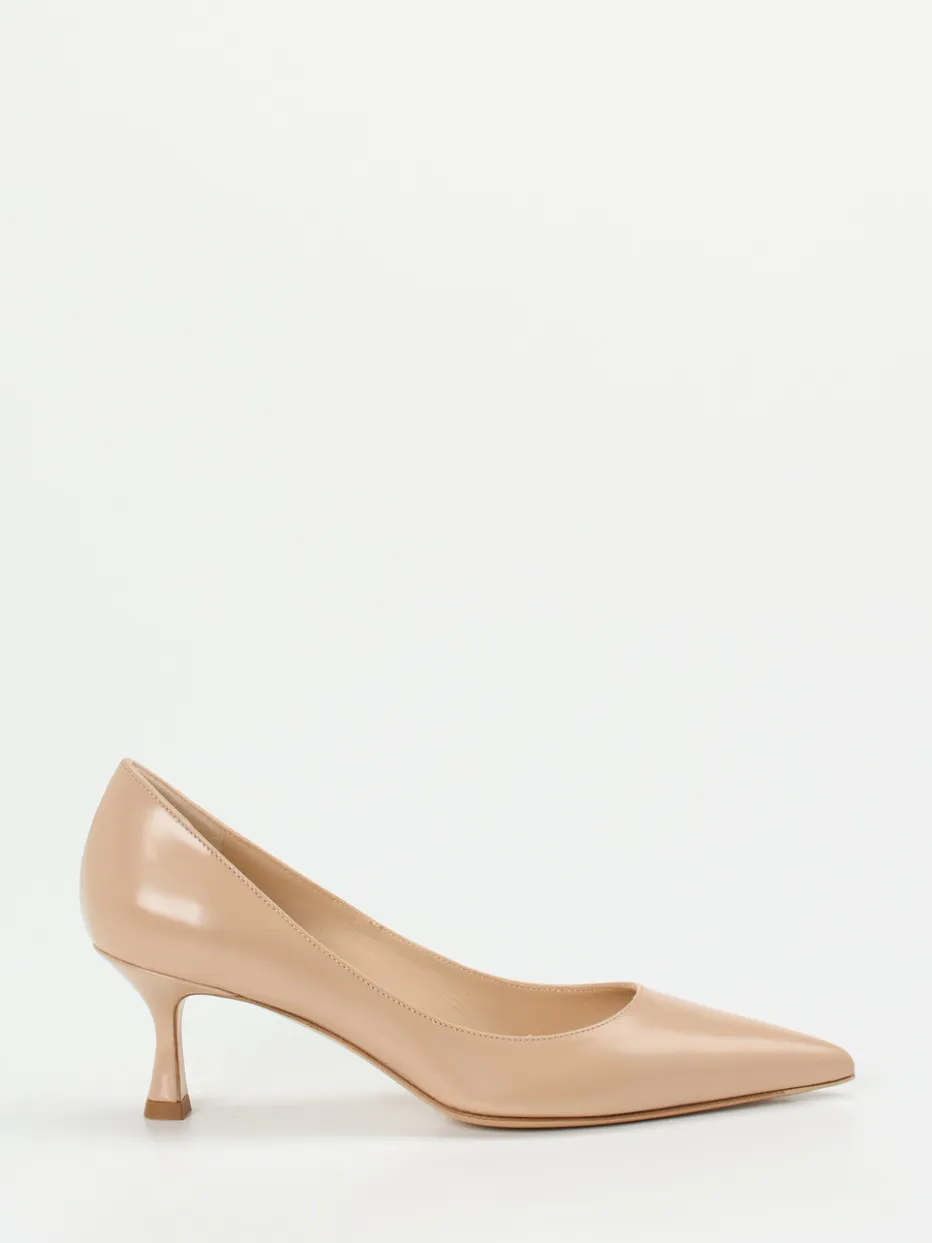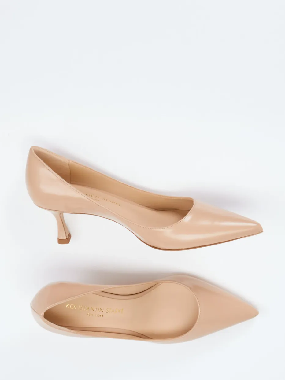 Stilvolles Understatement für besondere Anlässe.Konstantin Starke präsentiert elegante Damenpumps mit feminin-spitzem Leisten und dezentem Kitten Heel. Ideal für Business-Meetings oder formelle Empfänge setzen diese Pumps auf glänzendes Hochglanzleder in einem warmen Beige. Das soft gepolsterte Fußbett und das Innenfutter aus Ziegenleder bieten hohen Komfort bei jeder Gelegenheit. Designmerkmale wie die Ton-in-Ton-Optik, die fehlenden Nähte und die klare Linienführung unterstreichen die minimalistische Ästhetik. Der Kitten Heel mit 5 cm Laufhöhe sorgt für eine elegante, aber komfortable Aufrichtung. Ein Ansprechpartner für klassisch-minimalistische Stilwelten mit dezent luxuriöser Note.