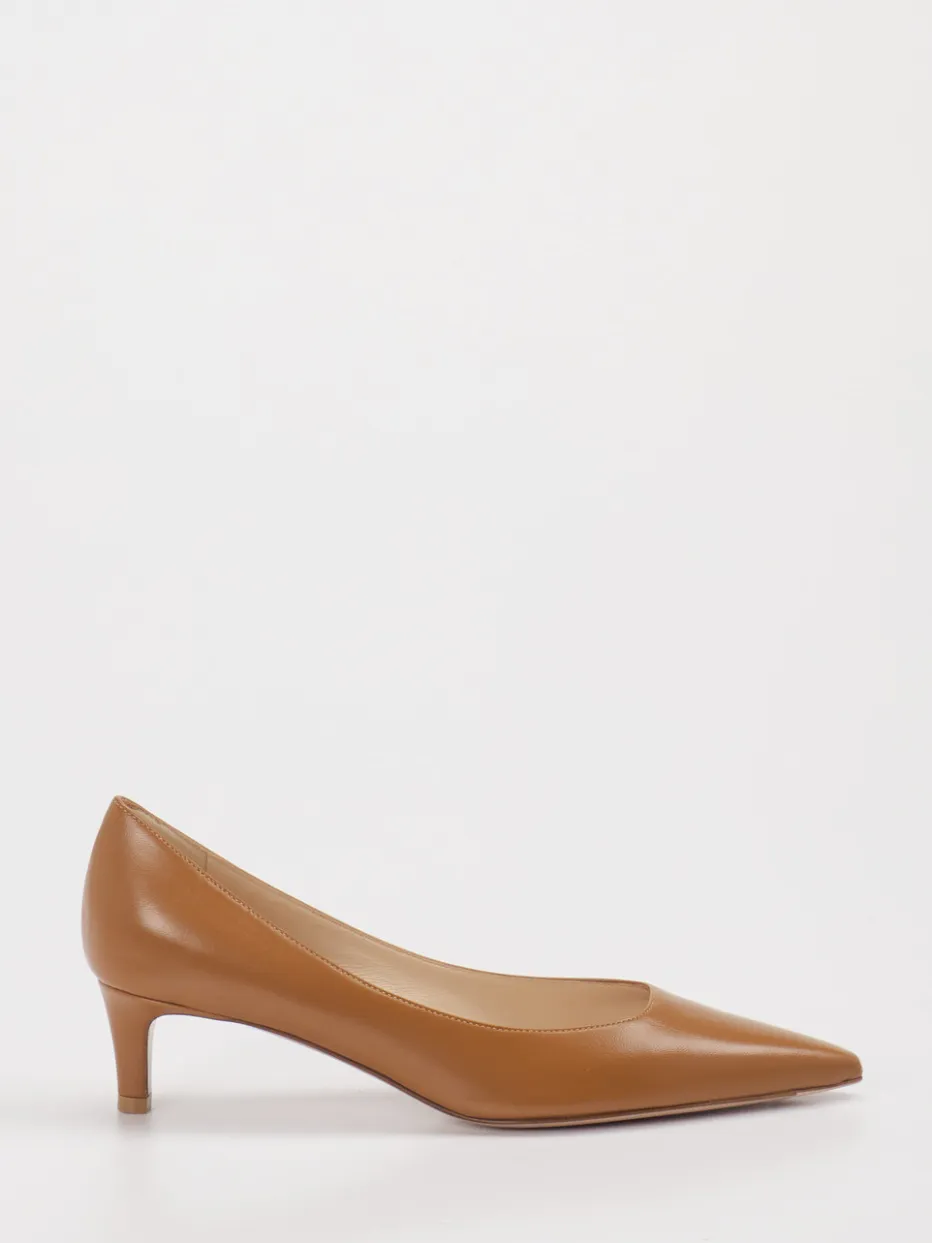 Diese Pumps aus hochwertigem, glänzendem Lammleder in Cognacbraun überzeugen durch eine spitz zulaufende Form und eine alltagserprobte Absatzhöhe von 4,5 cm. Der elegante Kitten Heel und das zurückhaltende, tonale Design unterstreichen den minimalistischen Charakter. Innen sorgt softes Ziegenleder in Nude für angenehmen Tragekomfort, während die Ledersohle besonders für Indoor-Anlässe geeignet ist. Perfekt abgestimmt auf Looks im Stil von „Quiet Luxury“ oder klassische Business-Outfits, lassen sie sich ideal mit cognacfarbenen Taschen und hellen Blazern kombinieren.