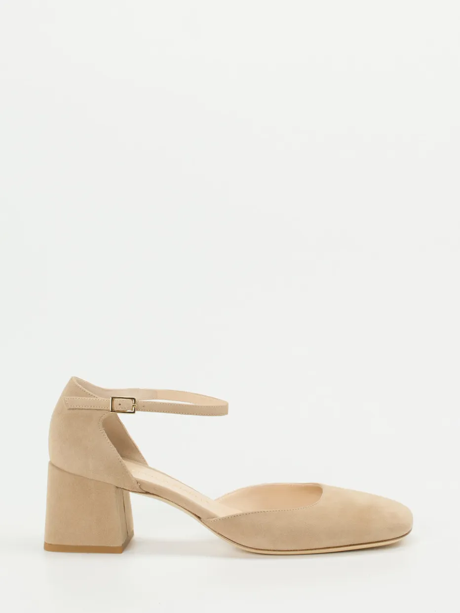 Die Pumps kombinieren weiches Veloursleder mit einer femininen Silhouette und setzen mit goldfarbener Schnalle stilvolle Akzente. Ideal für formelle Anlässe und ruhige Luxus-Looks.