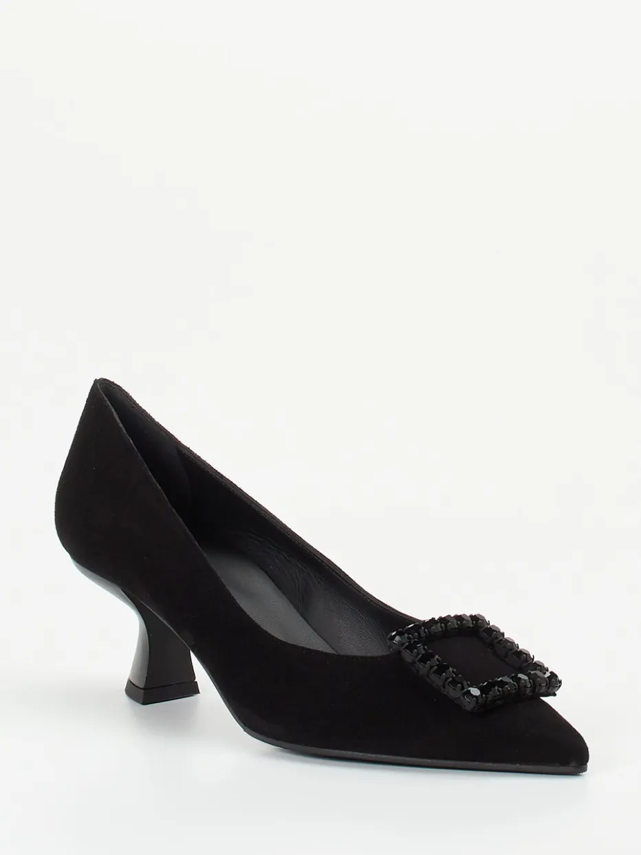 Filigraner Chic trifft auf luxuriöse Zurückhaltung: Diese Pumps von Konstantin Starke setzen mit edlem Veloursleder und glitzernder Agraffe stilvolle Akzente.