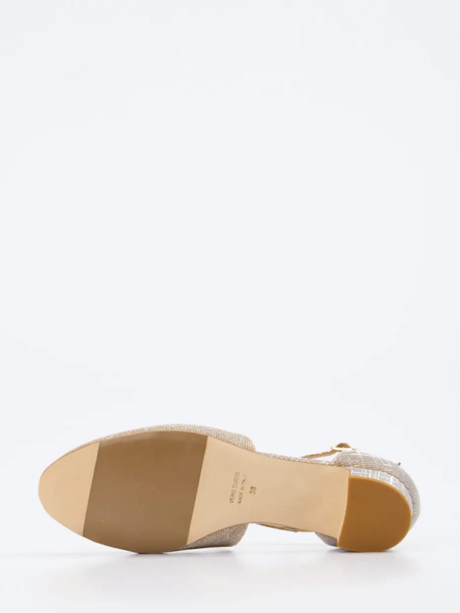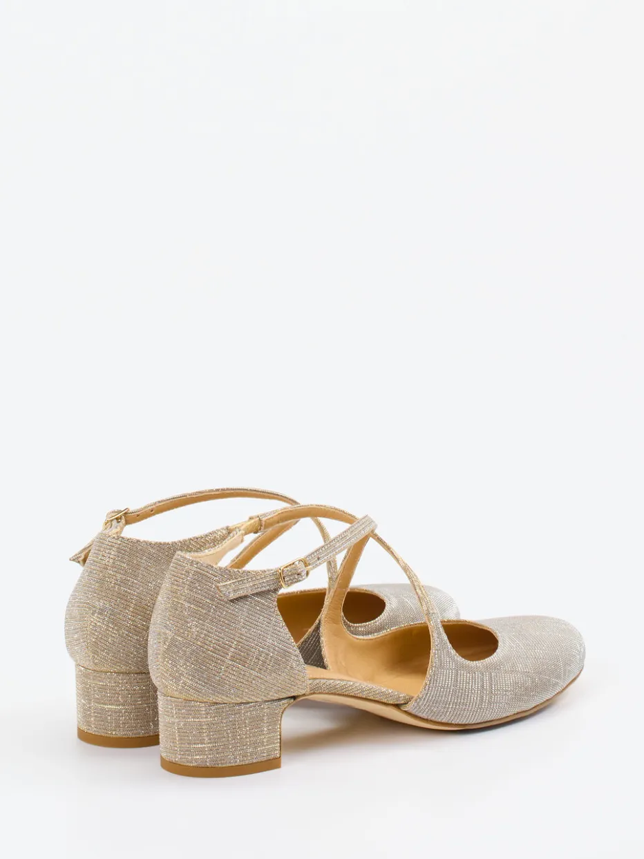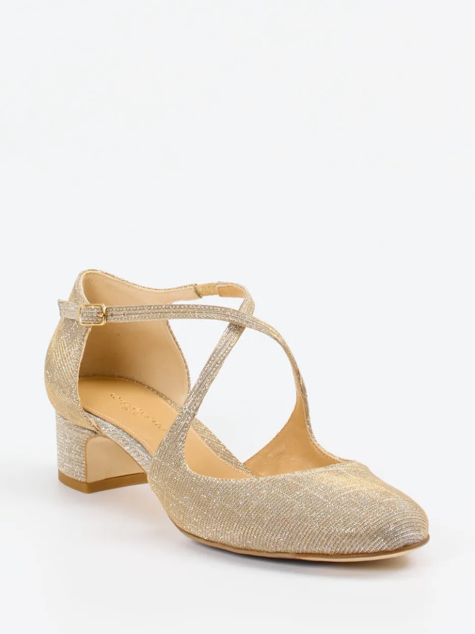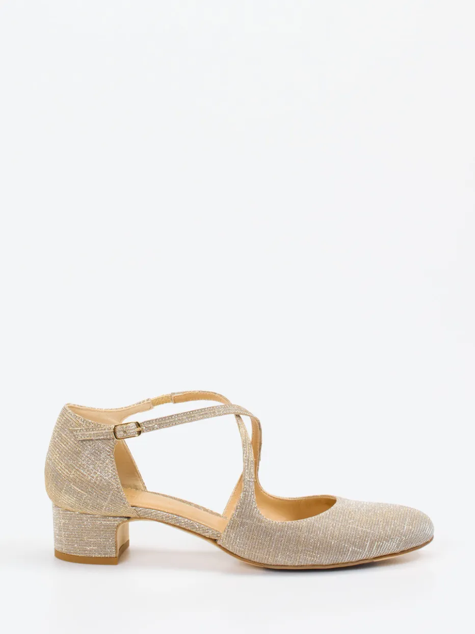 Die champagnerfarbenen Riemchenpumps verbinden Vintage-Charme mit modernem Metallic-Look und bieten durch den Blockabsatz angenehmen Komfort – ideal für festliche Anlässe.