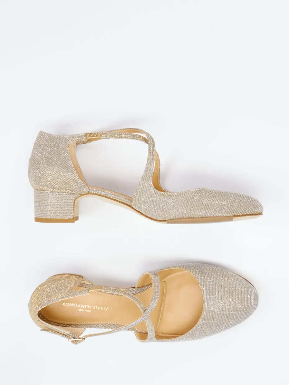 Funkelnder Akzent für festliche Momente.Konstantin Starke präsentiert elegante Riemchenpumps für Damen. Perfekt geeignet für stilvolle Abende, überzeugen diese Pumps durch champagnergoldenes Metallicleder mit feinem Glitzergarn. Die klassisch-runde Form mit überkreuzten Riemchen betont den Fußrücken und wird ergänzt durch eine goldfarbene Schnalle. Innen sorgt softes Ziegenleder für hohen Tragekomfort, unterstützt vom stabilen Blockabsatz. Der schimmernde Glanz fügt sich in aktuelle Trends rund um „Quiet Luxury“ und „Metallic Accents“ ein. Kombiniert mit einer Metallic-Clutch entsteht ein harmonischer Look. Stilsicherheit trifft auf Komfort für besondere Augenblicke.