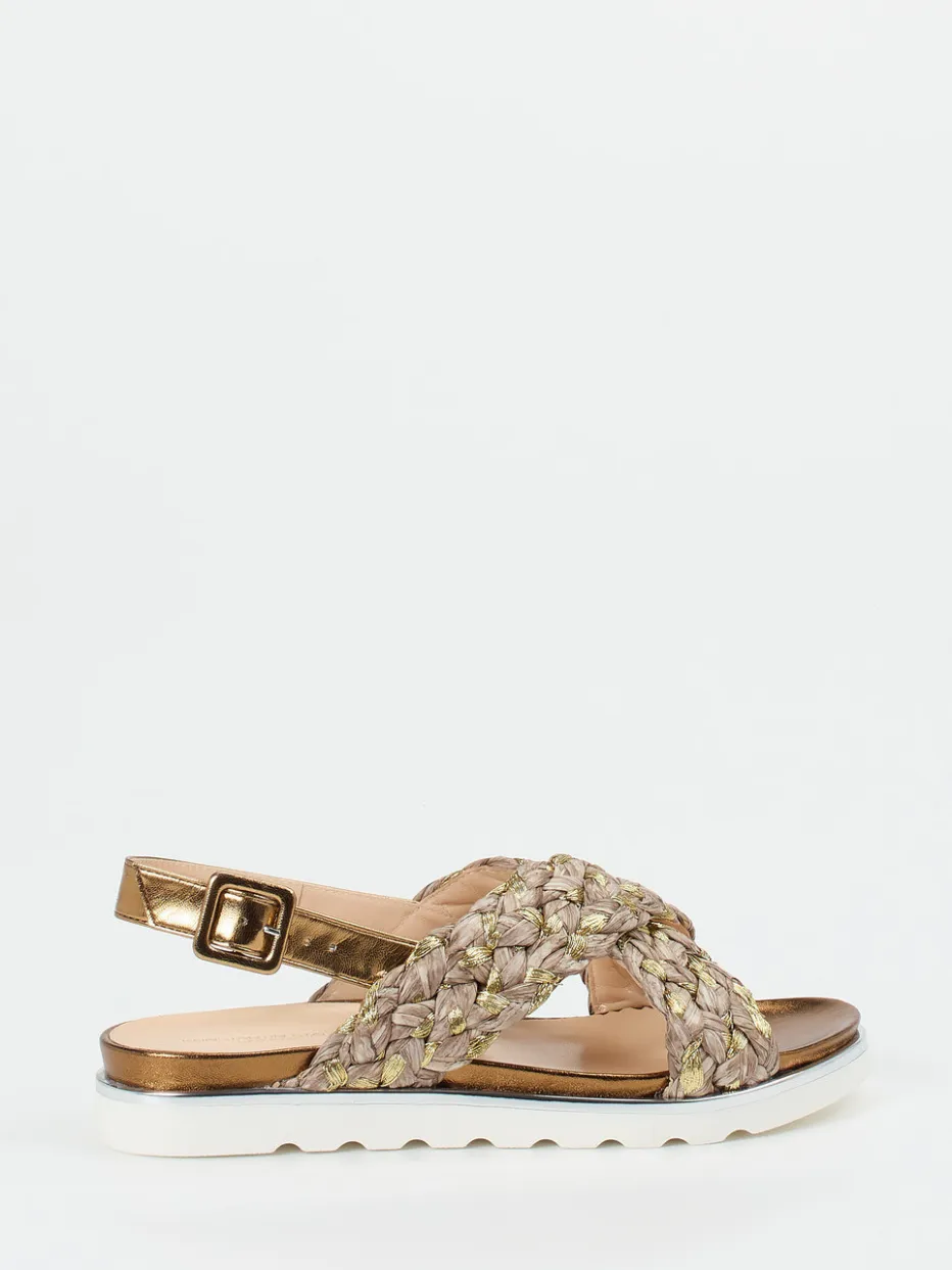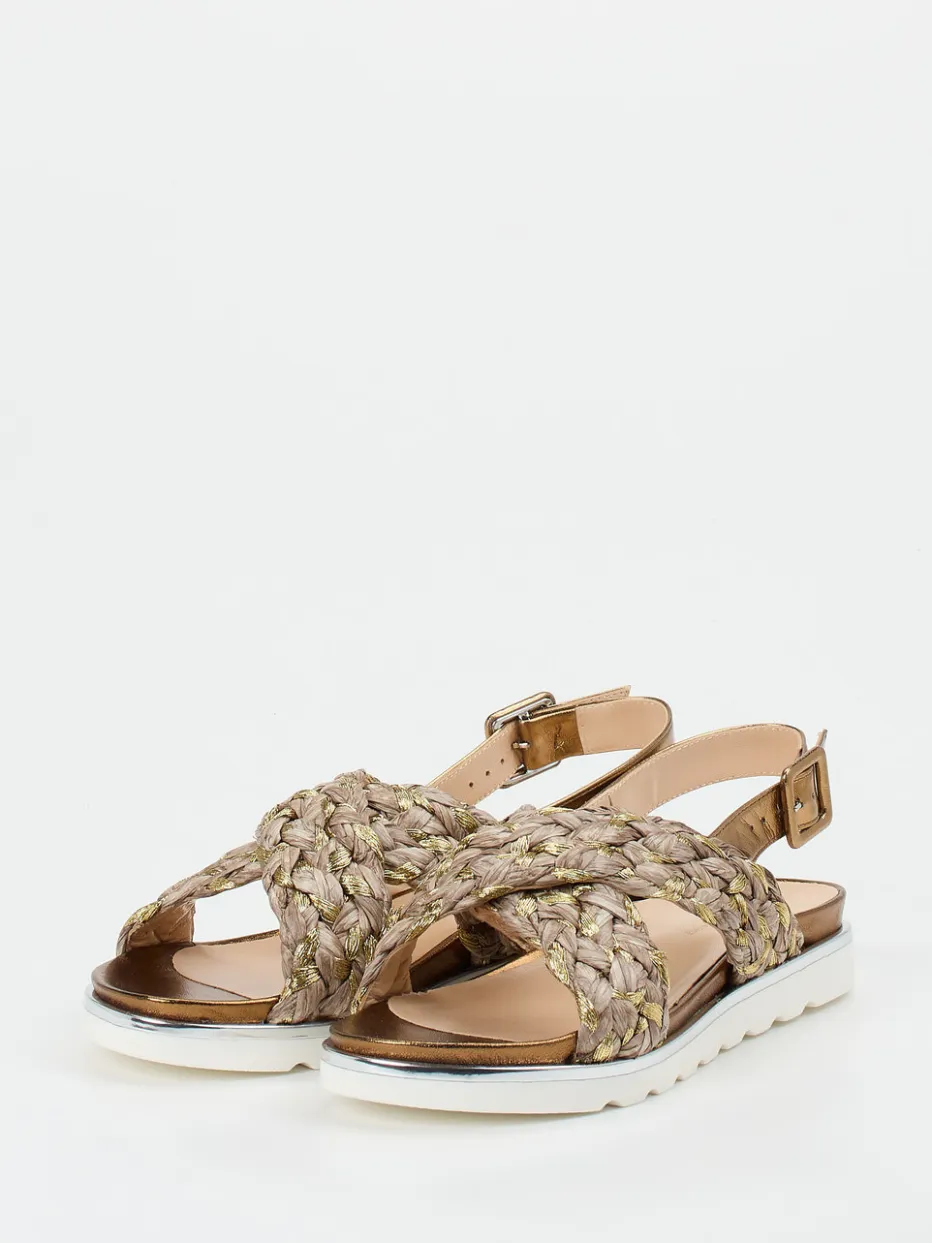 Diese Damen-Sandale kombiniert mattes Flechtleder in Beigebraun mit glänzenden Metallic-Details. Ihre Plateau-Gummisohle sorgt für komfortables Gehen im Sommeralltag.