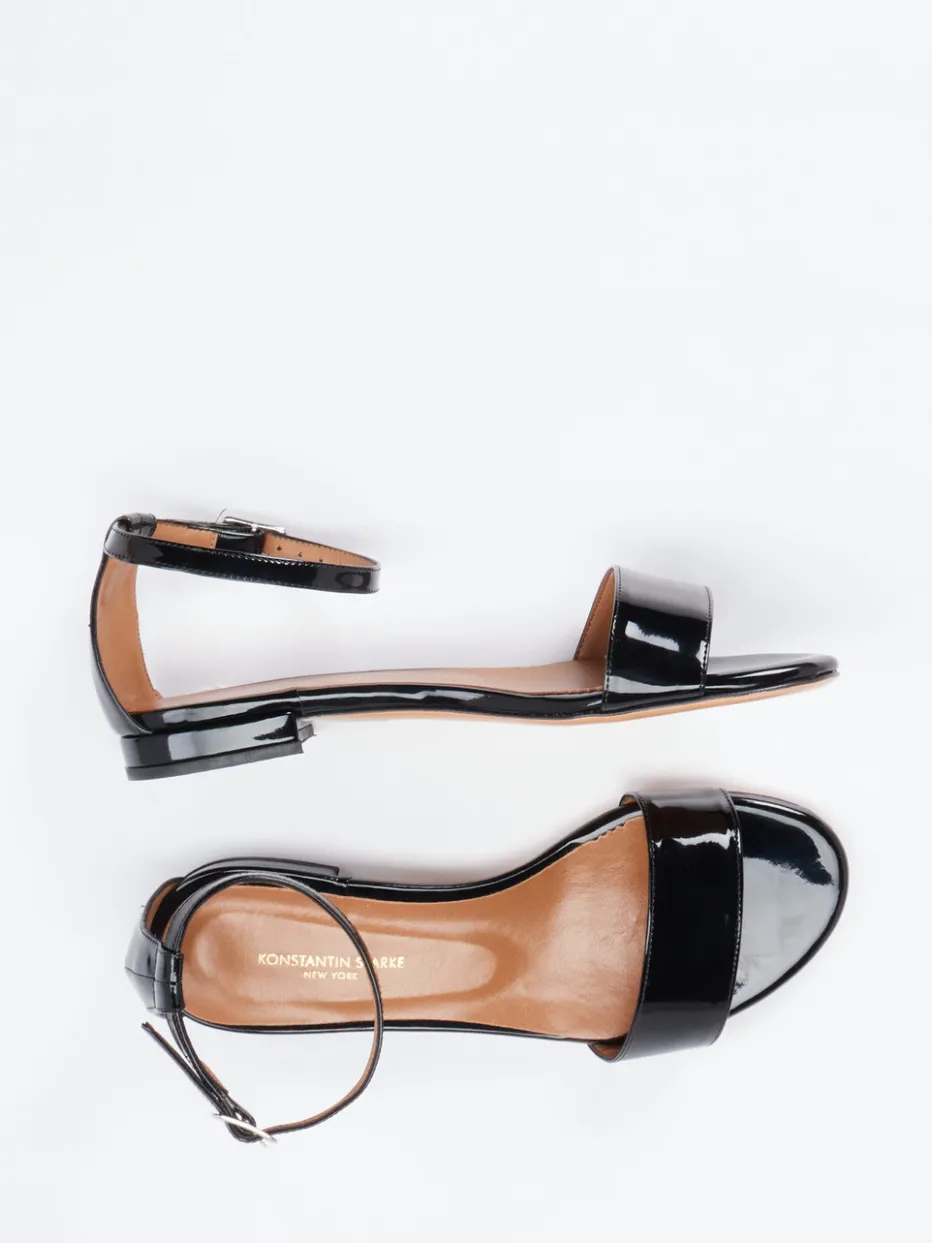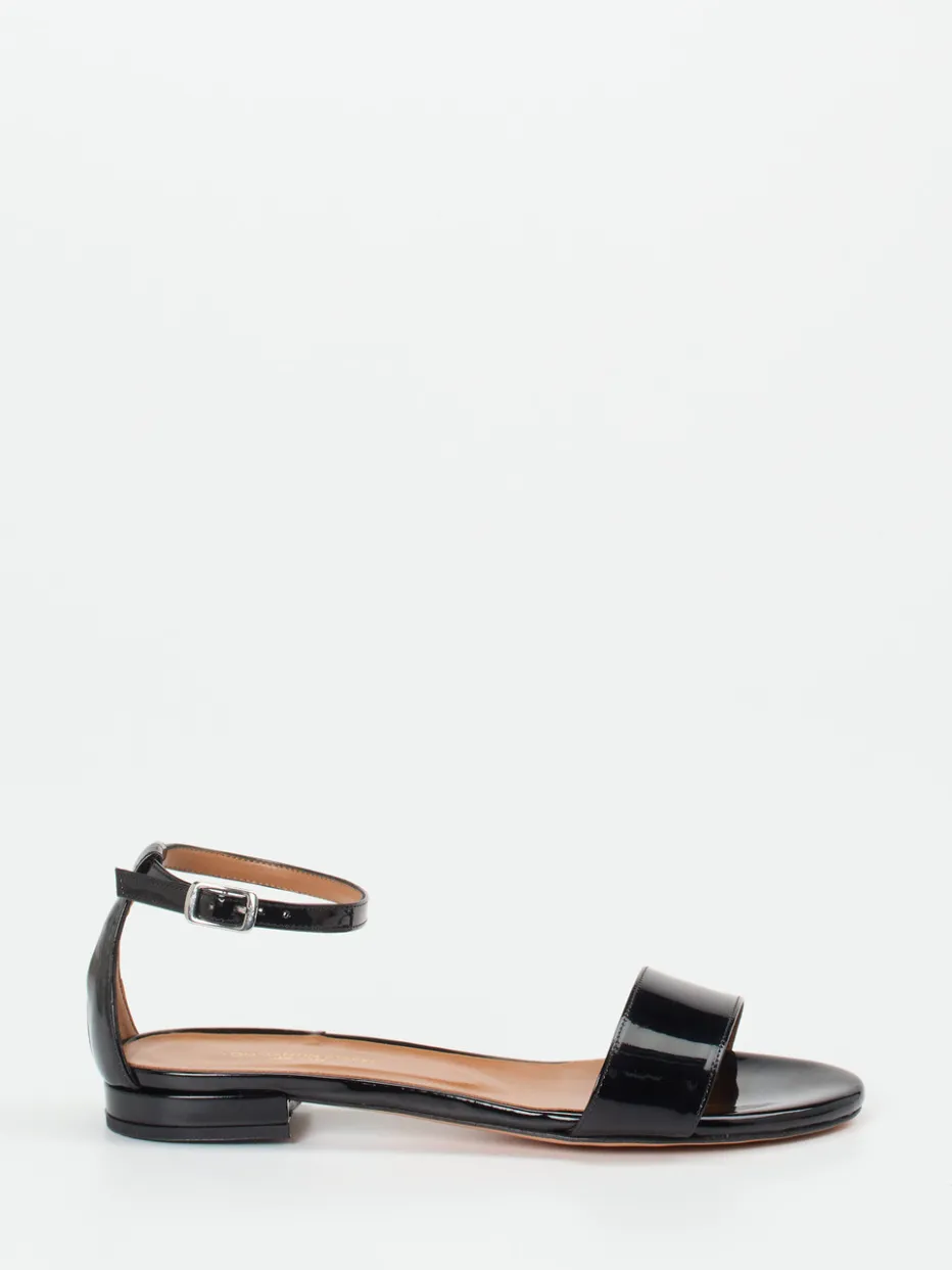 Die flache Riemchensandale aus glänzendem Lackleder vereint italienische Handwerkskunst mit moderner Eleganz und ist vielseitig tragbar – vom sommerlichen Stadtbummel bis zum eleganten Anlass.