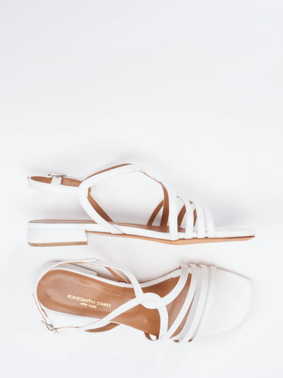 Modern Chic für sonnige Tage.Konstantin Starke präsentiert eine fein verarbeitete Riemchensandale aus weißem Lackleder. Perfekt für Städtereisen oder entspannte Sommernachmittage passt sich das Modell mit seinem verstellbaren Fersenriemen komfortabel dem Fuß an. Das glatte, glänzende Lackleder betont die kreuzweise geführten Riemen im Vorderfußbereich und harmoniert mit der flachen, hochwertigen Kunststoffsohle in Beige. Die silberfarbene Schnalle und die dezente Ton-in-Ton-Verarbeitung wirken modern und zurückhaltend zugleich. Die klar-minimalistische Formensprache spricht Liebhaber des Quiet Luxury ebenso an wie Fans von White-on-White-Looks. Kombiniert mit luftigen Kleidern oder Leinenhosen entsteht ein eleganter Sommerstil. Zeitgemäßes Design in hochwertiger Verarbeitung – typisch Konstantin Starke.