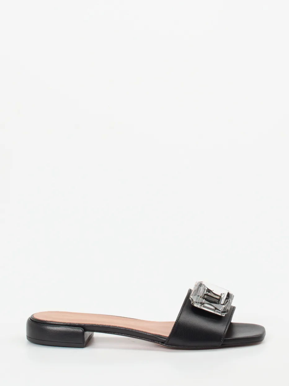 Die edle Kristallverzierung auf schwarzem Lammleder verleiht diesen Slides von Konstantin Starke ihren Signature-Look. Feine Materialien treffen auf minimalistische Raffinesse.