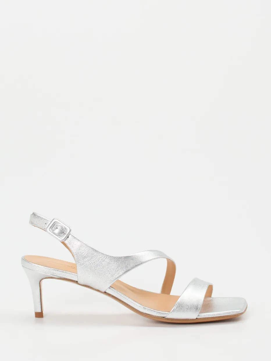 Silberner Glamour und raffinierte Linienführung machen diese Abendsandalette zu einem stilvollen Begleiter für festliche Anlässe. Die elegante Carréform sorgt für modische Präsenz mit Understatement.