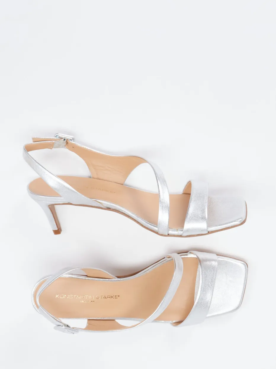 Glamouröse Leichtigkeit für besondere Abende.Die Marke Konstantin Starke präsentiert eine elegante Sandalette für Damen mit besonderem Anspruch. Ideal für stilvolle Eventabende bietet diese Sandale aus edlem Metallicleder mit glänzender Oberfläche einen femininen Auftritt. Der asymmetrische Riemenverlauf mit anpassbarer Schnalle, die silberfarbene Ton-in-Ton-Optik und die sanft eckige Carréleisten zeugen von dezenter Opulenz. Der unterstellte Absatz mit angenehm tragbarer Höhe garantiert Komfort auch bei langem Tragen. Das Design spiegelt den Metallic- und „Quiet Luxury“-Trend der Saison wider. Ein Highlight für Abend-Looks – minimalistisch und luxuriös zugleich.