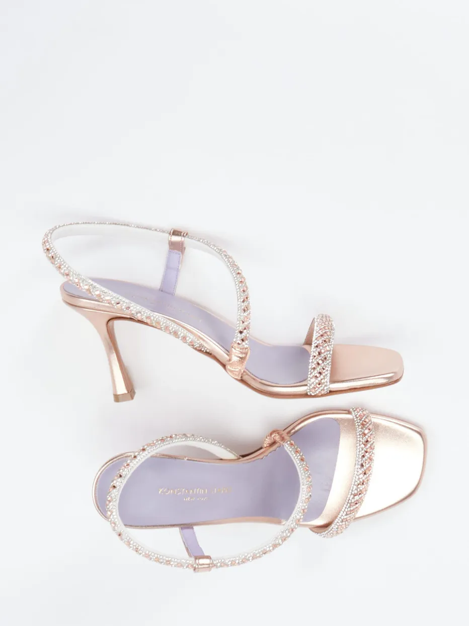 Die Damen-Sandalette von Konstantin Starke verbindet hochwertiges Metallicleder mit einer glänzenden Ausstrahlung in softem Roségold. Strassbesetzte Riemchen setzen funkelnde Akzente und betonen die feminine Silhouette auf stilvolle Weise.