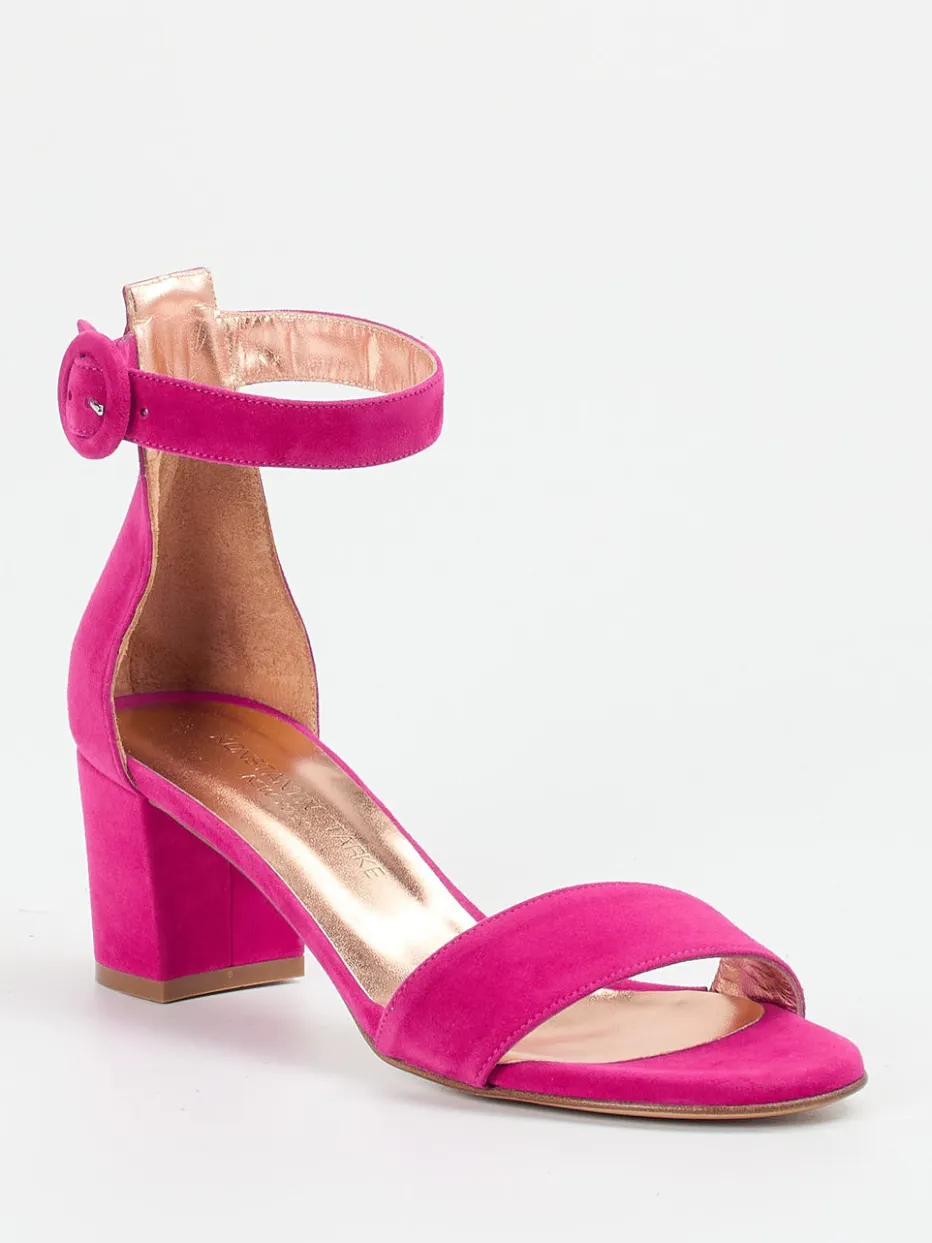Ideal für besondere Anlässe bietet sie durch den 5,5 cm hohen Blockabsatz sicheren Stand – selbst auf langen Abenden. Das pinkfarbene Veloursleder, samtig angeschliffen, trifft auf ein schimmerndes Kalbleder-Innenfutter in Roségold. Der Knöchelriemen mit toniger Dornschließe betont die offene Silhouette und unterstreicht die feminine Eleganz. Inspiriert vom Barbiecore-Trend und Color-Pop-Looks der Saison wirkt dieser Stil minimalistisch und gleichzeitig ausdrucksvoll. Perfekt zu pastellfarbenem Sommerkleid oder Metallic-Accessoires.