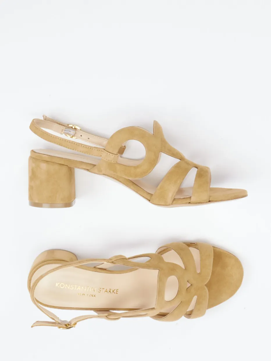 Modern und feminin zugleich.Konstantin Starke präsentiert Damen-Sandaletten der Kategorie Blockabsatz für den Sommer. Für Tage, an denen Eleganz und Komfort harmonieren sollen: Die Sandaletten in Camel bestehen aus feinstem Veloursleder mit samtig-matter Oberfläche und sind mit Lammnappa gefüttert. Ein runder Cut-Out-Verlauf, der verstellbare Fersenriemen mit goldfarbener Schnalle und eine cleane Silhouette betonen den femininen Charakter. Die Ledersohle unterstreicht das hochwertige Design, der stabile 5,5 cm Blockabsatz liefert sicheren Halt für Alltag und Event. Das Modell greift den Soft-Neutrals-Trend auf und lässt sich mühelos mit cremefarbenen Outfits kombinieren. Ein stilvoller Begleiter mit zurückhaltender Raffinesse – typisch Konstantin Starke.