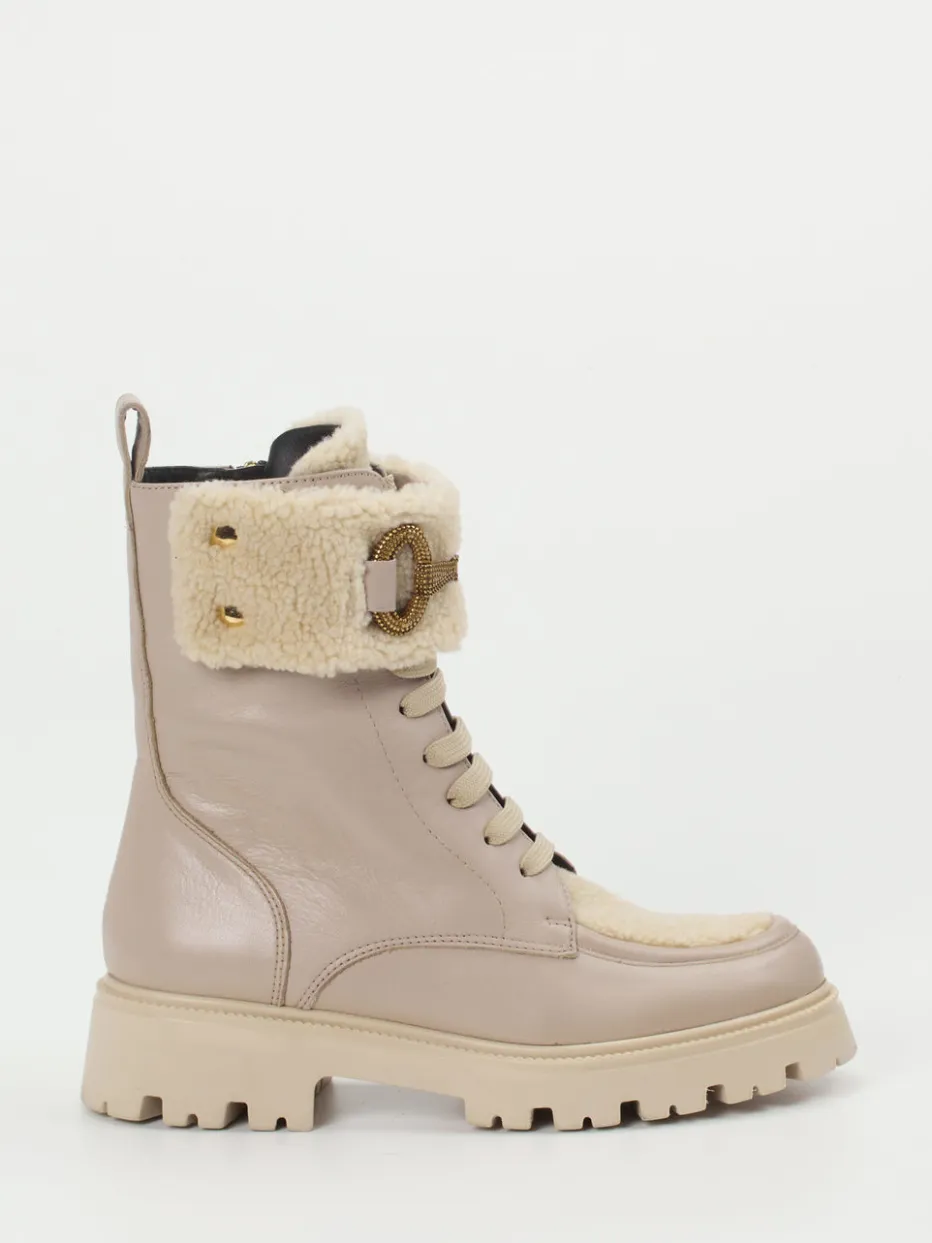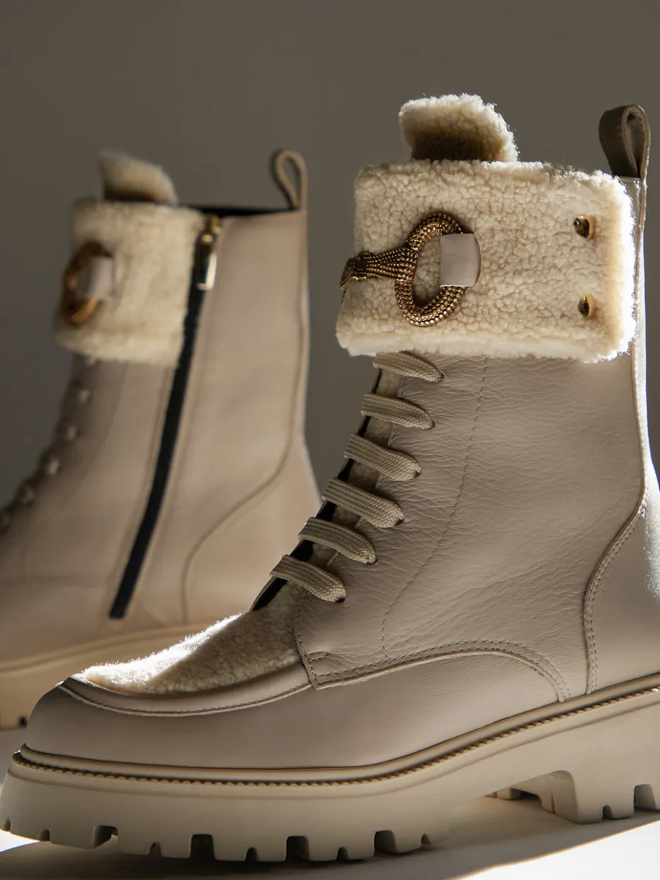 Diese Schnürboots vereinen hochwertiges Kalbleder mit modischem Lammfellbesatz und einer goldfarbenen Schnalle – ideal für anspruchsvolle Looks im Herbst und Winter.