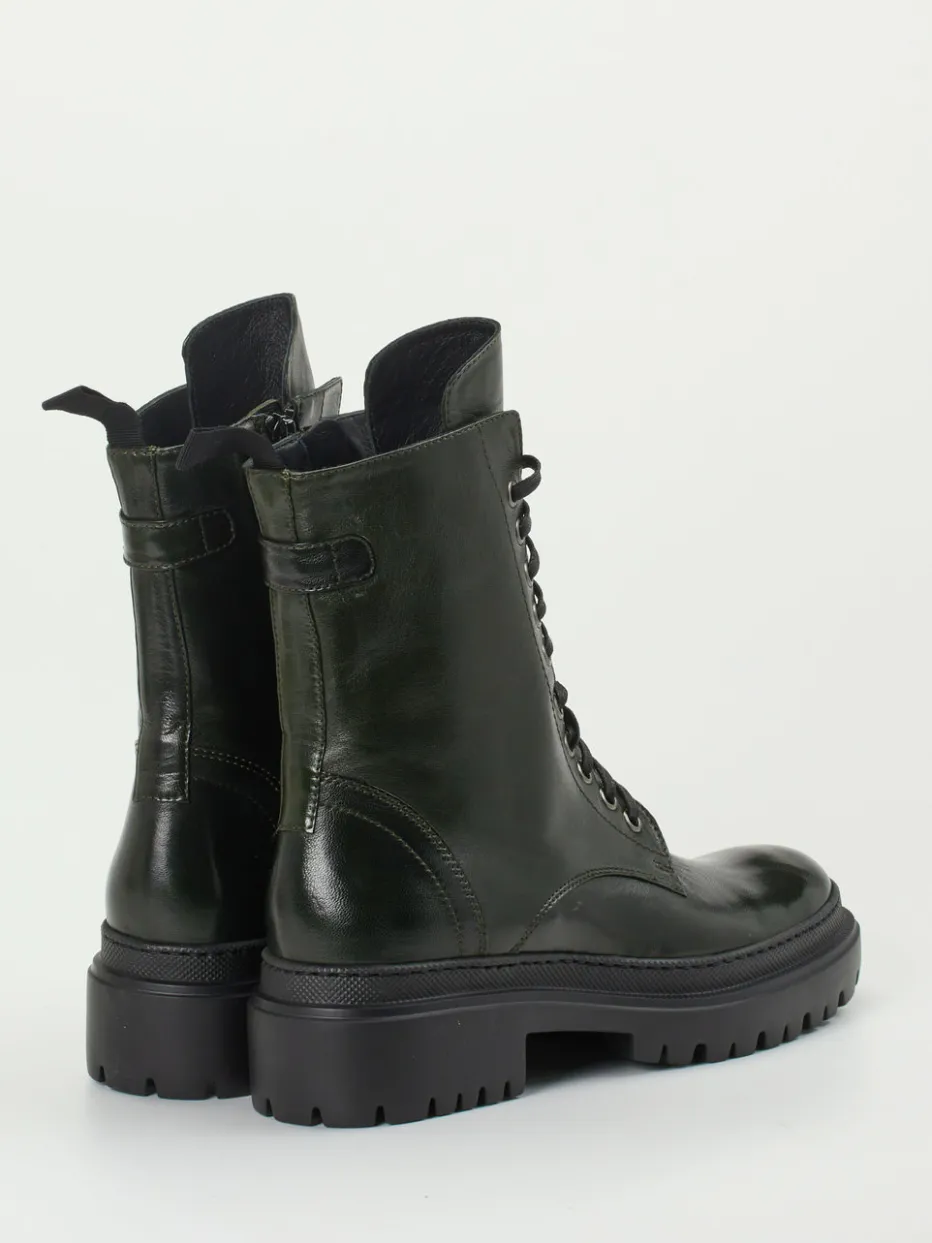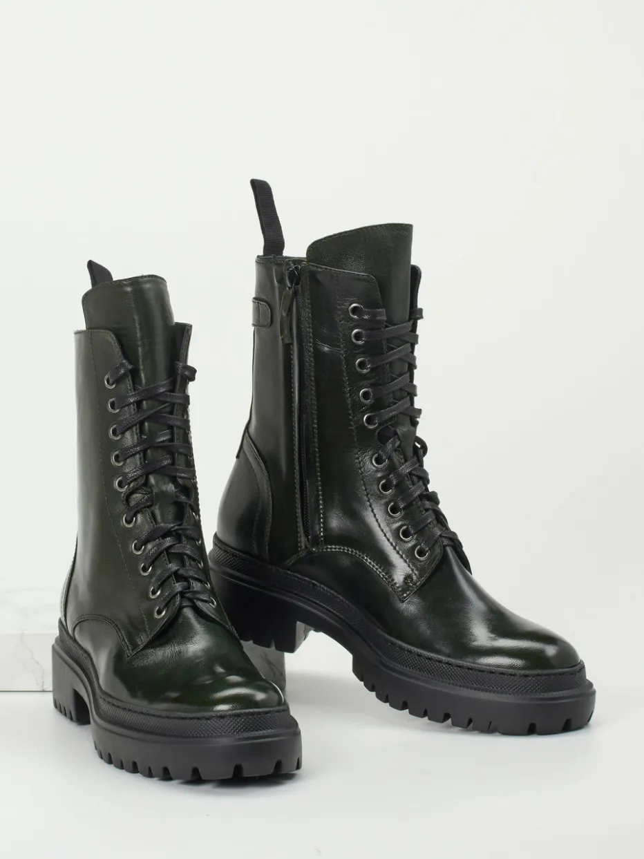 Herbstlicher Stil trifft urbane Funktion.Konstantin Starke bringt mit diesen Damen-Schnürboots ein Highlight der Saison. Ob Stadtspaziergang oder Wochenendausflug – das handschuhweiche Lammleder mit glänzender Oberfläche bietet nicht nur Stil, sondern auch langlebigen Tragekomfort. Die dunkelolivgrüne Farbgebung und die klassische, schmale Silhouette mit mittelhohem Schaft betonen den urbanen Charakter. Schwarze Metallösen, Schnürung und ein seitlicher Reißverschluss vereinen Design und Funktion, während die strukturierte Gummiprofilsohle sicheren Grip bietet. Stilistisch beeinflusst von Military und Dark Utility, lassen sich die Boots ideal zu Oversized-Parka und Strick kombinieren. Der kompromisslose Mix aus Komfort und Design macht diesen Look alltagstauglich auf allen Wegen.