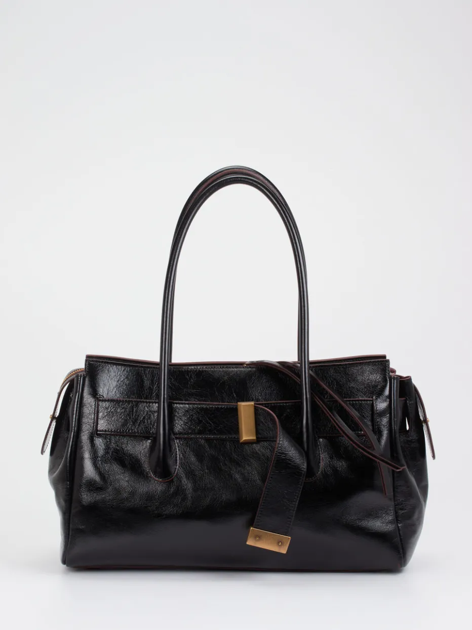 Diese elegante Tasche kombiniert glänzendes Lackleder mit klarer Struktur und goldfarbenen Akzenten – perfekt für einen stilvollen Auftritt im Alltag oder Business-Kontext.