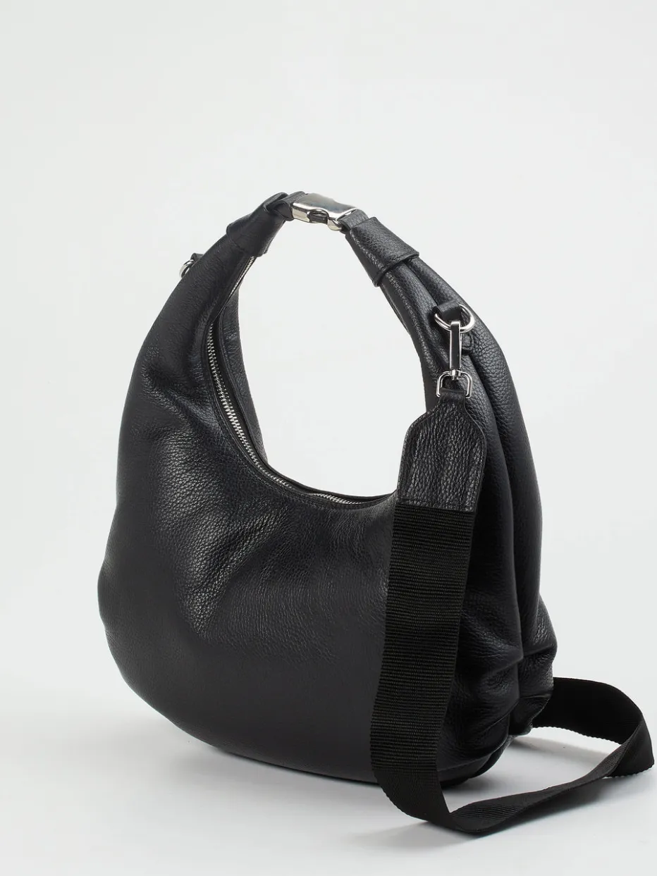 Fein genarbtes Kalbleder und eine halbmondförmige Silhouette verleihen der Tasche eine moderne Leichtigkeit. Funktionalität trifft auf subtilen Luxus.