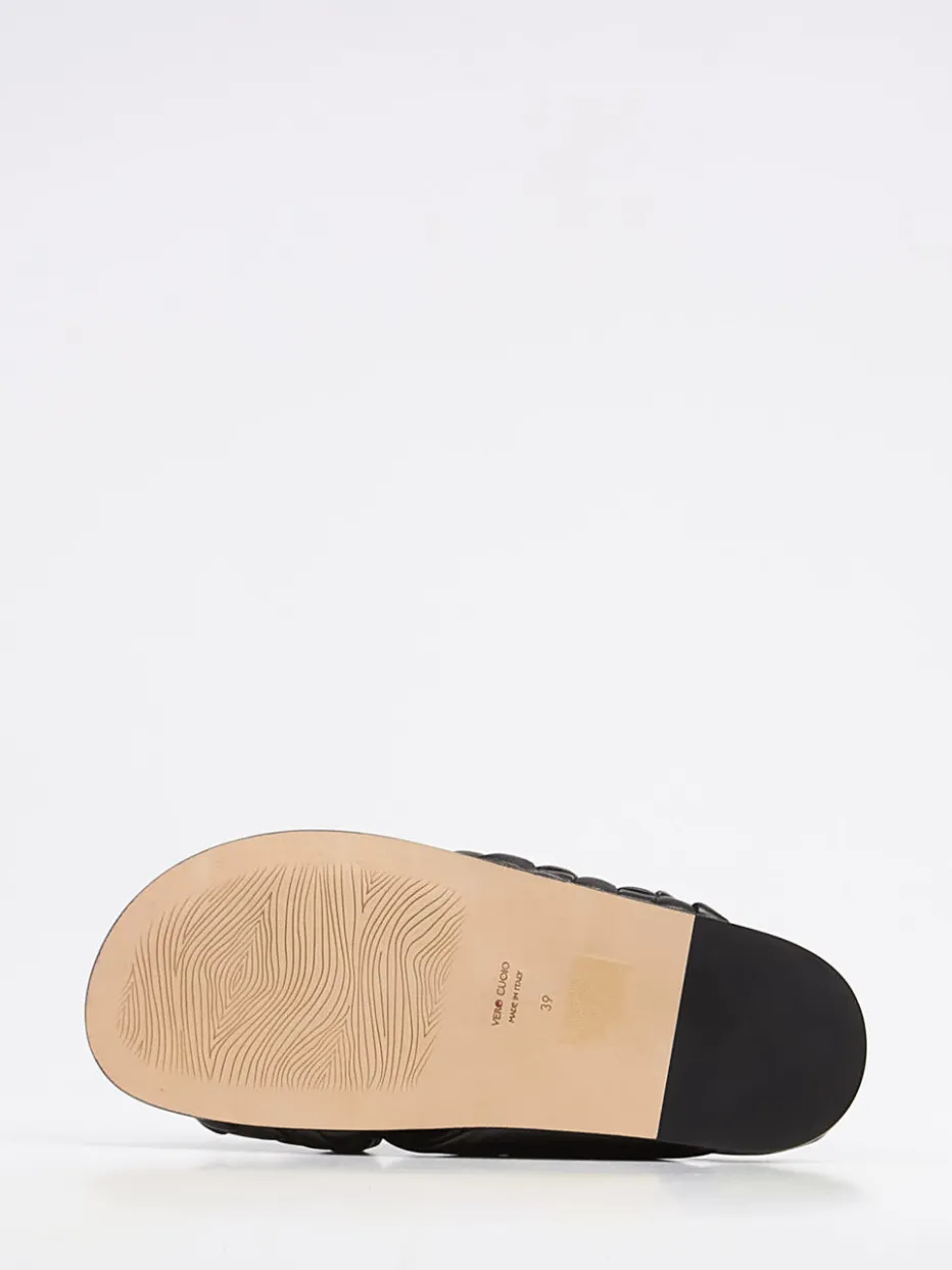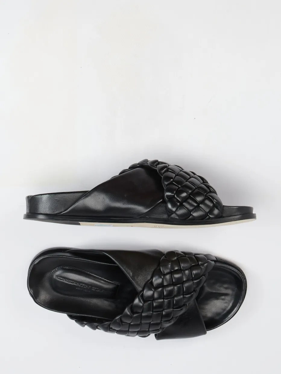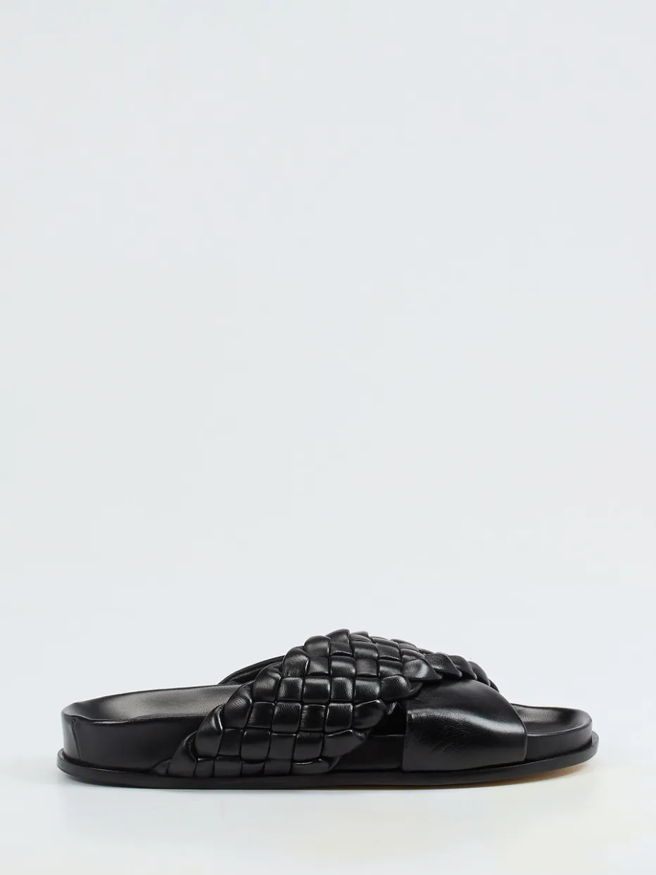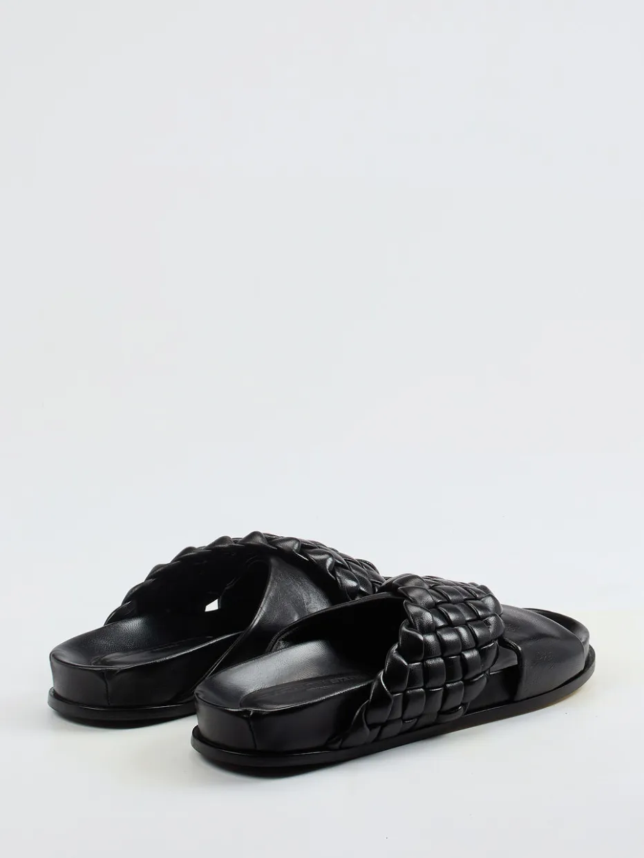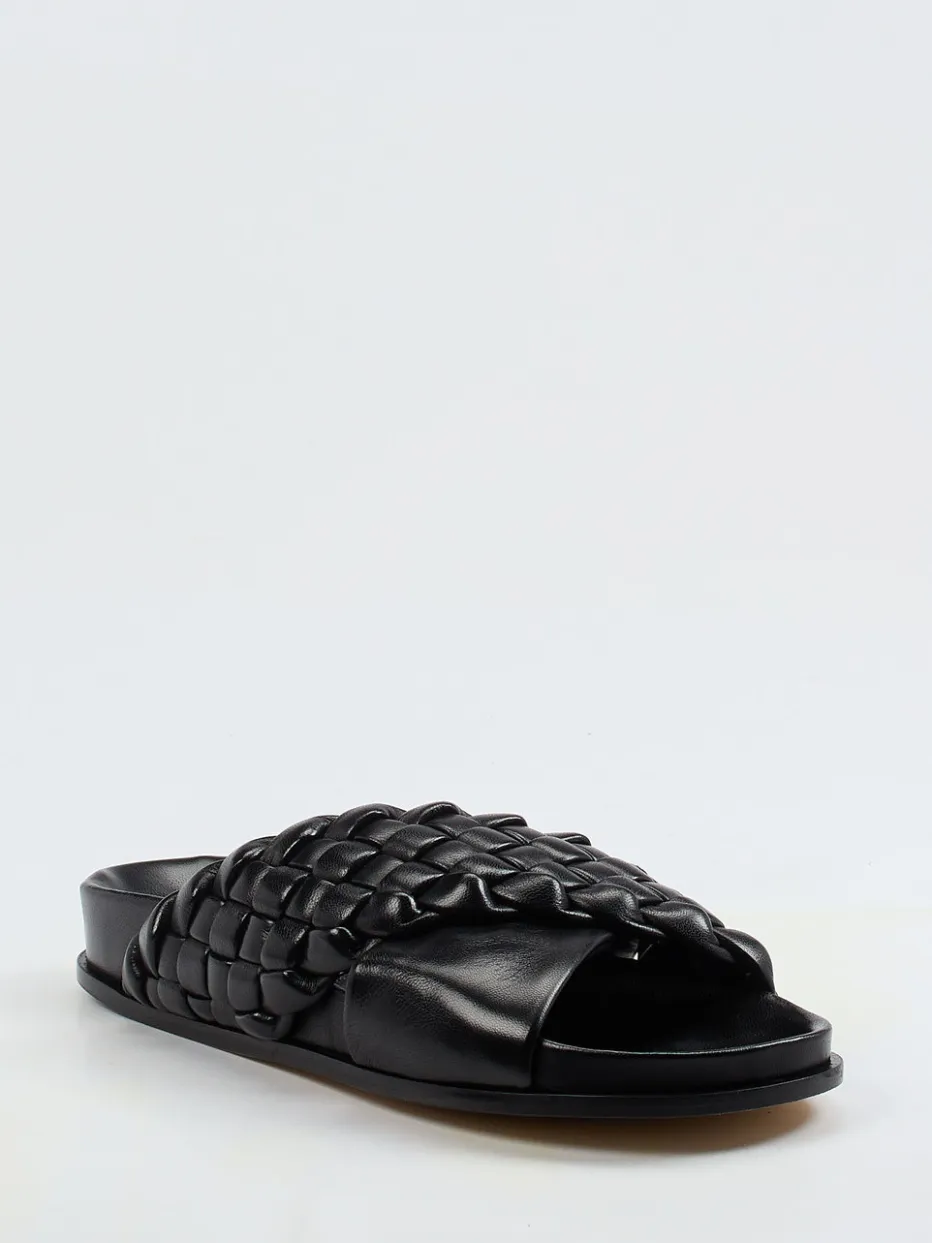 Geflochtenes, glänzendes Flechtleder in tiefem Schwarz trifft auf ein flaches, offenes Design – perfekt für minimalistische Looks mit hochwertiger Anmutung.