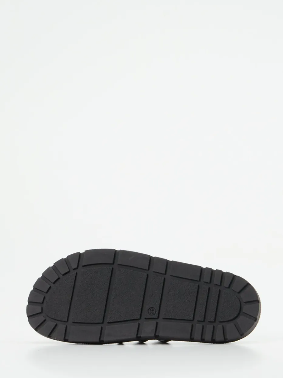 Ideal abgestimmt auf urbane Sommer-Tage, vereint das Design dezente Extravaganz mit praktischem Komfort. Das Obermaterial in Metallic-Optik wird von glitzernden Strassriemen veredelt, die auf der Silhouette mit offener Form und breiter Sohle glänzen. Die matt gehaltene Grundfarbe in Schwarz unterstreicht die stilistische Zurückhaltung, während das ergonomisch geformte Fußbett und die gepolsterte, profilierte Gummisohle für Langlebigkeit und Halt sorgen. Ohne Verschluss gestaltet, ist der Schuh ein unkomplizierter Begleiter für Freizeit- oder Abendlooks im Stil von „Quiet Luxury“.