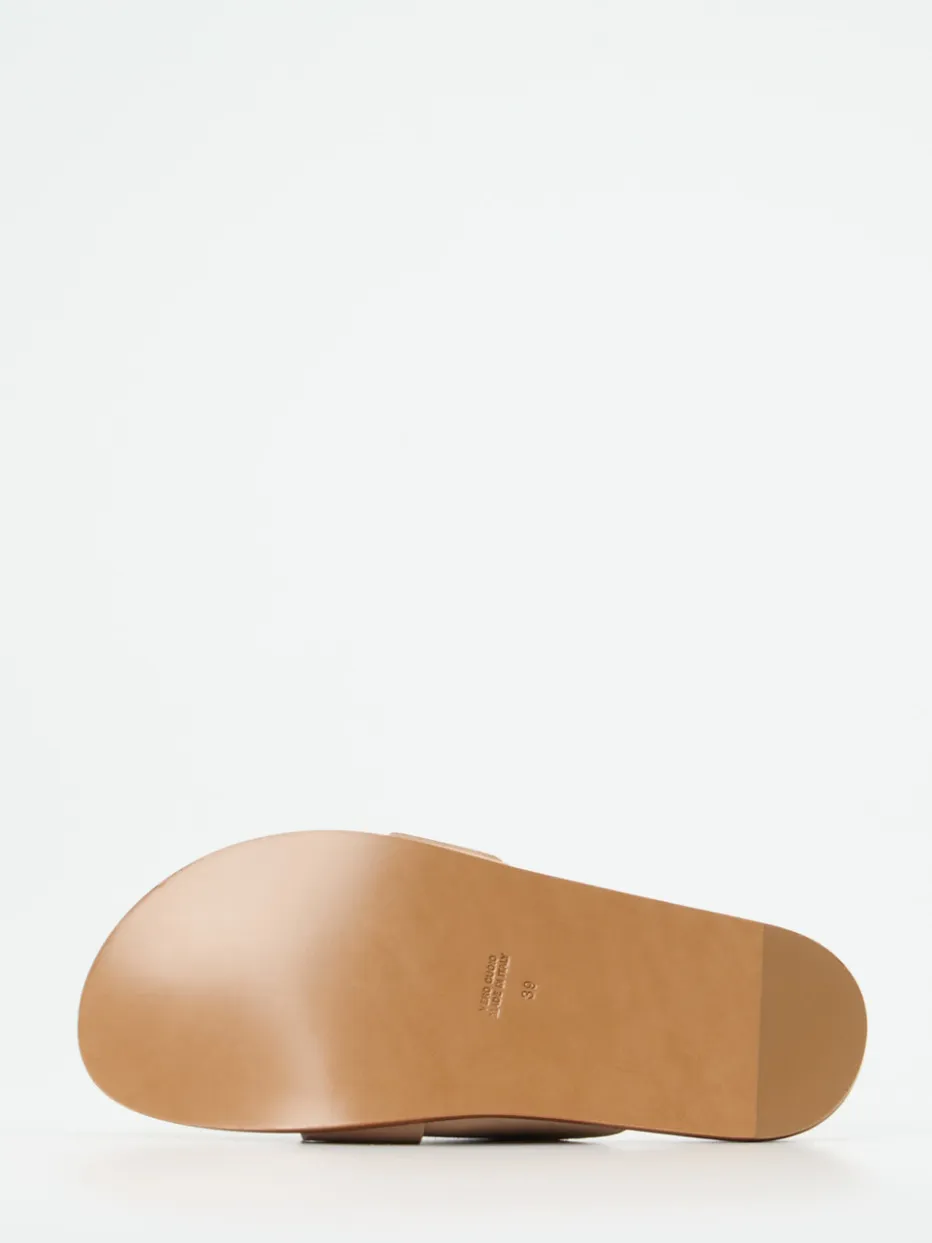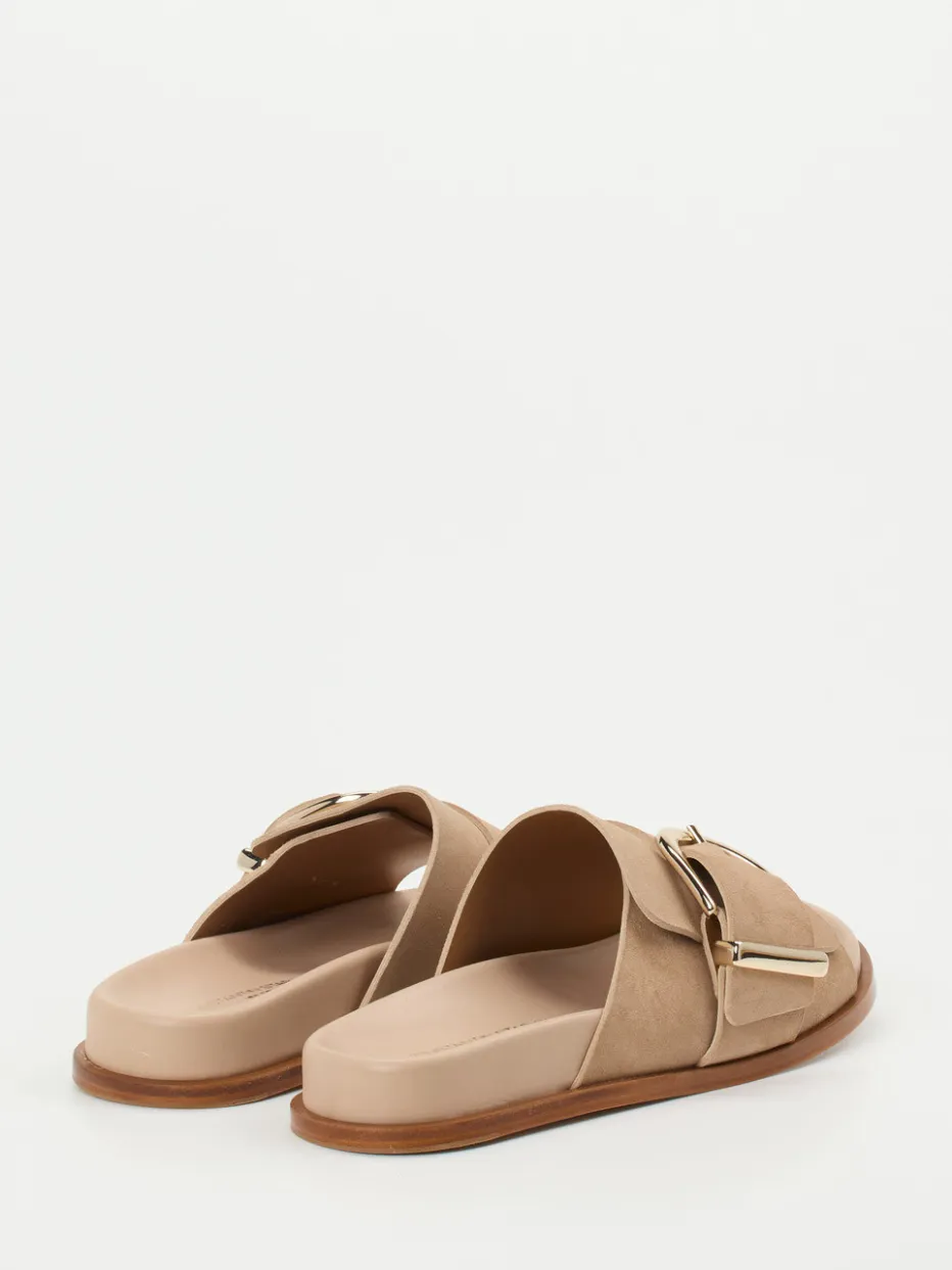 Ideal für Tage, an denen Komfort und Stil Hand in Hand gehen: Die sandbeigen Slides präsentieren sich in hochwertigem Veloursleder – samtig angeschliffen und angenehm weich. Der breite Riemen mit großer, goldfarbener Schnalle sorgt für einen edlen Hingucker. Das lederbezogene Tieffußbett ist ergonomisch geformt und weich gepolstert, während die flache Silhouette und die Ledersohle in Holzoptik für stilvolle Sommerlooks stehen. Der cleane Look passt hervorragend zum „Quiet Luxury“-Trend und harmoniert besonders gut mit Naturtönen wie Leinen oder Canvas.