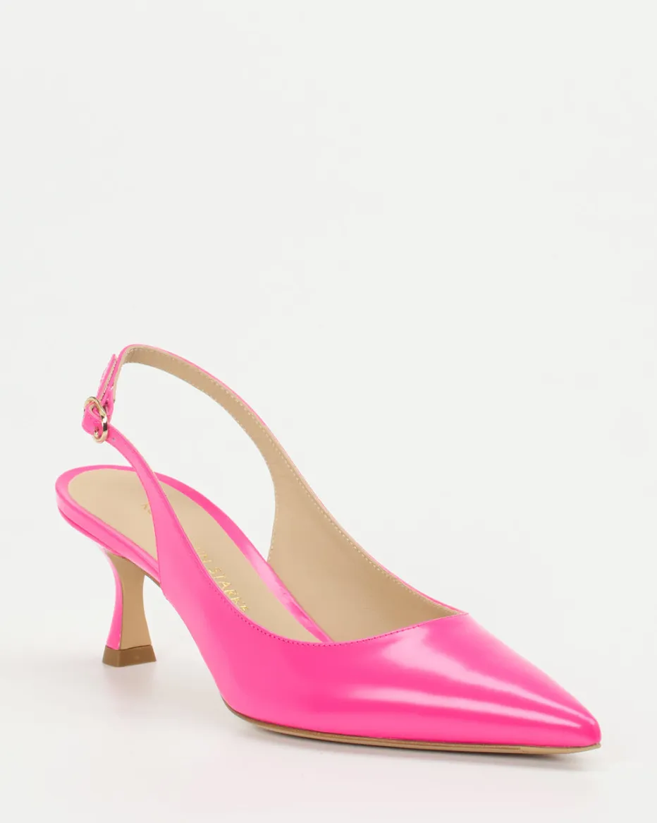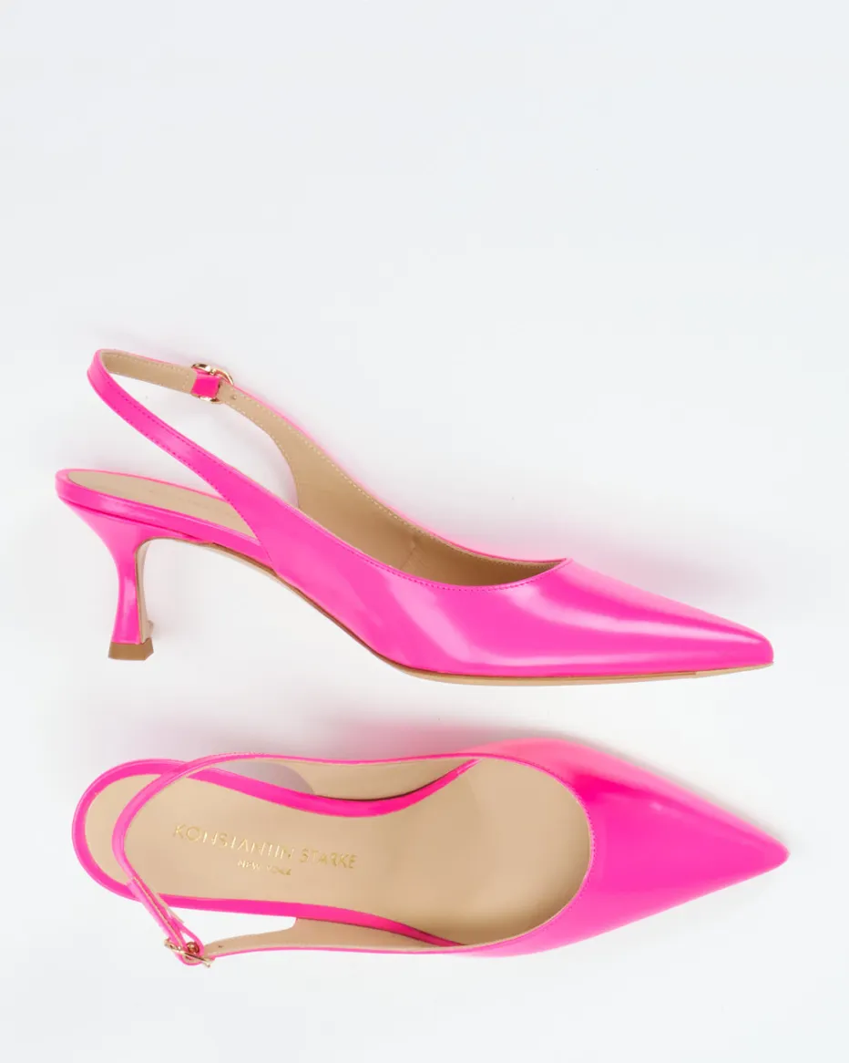 Die glänzenden Slingback-Pumps von Konstantin Starke überzeugen mit femininer Linienführung, trendigem Neonpink und komfortablem Kitten Heel – ein ausdrucksstarker Hingucker für elegante Party-Looks.