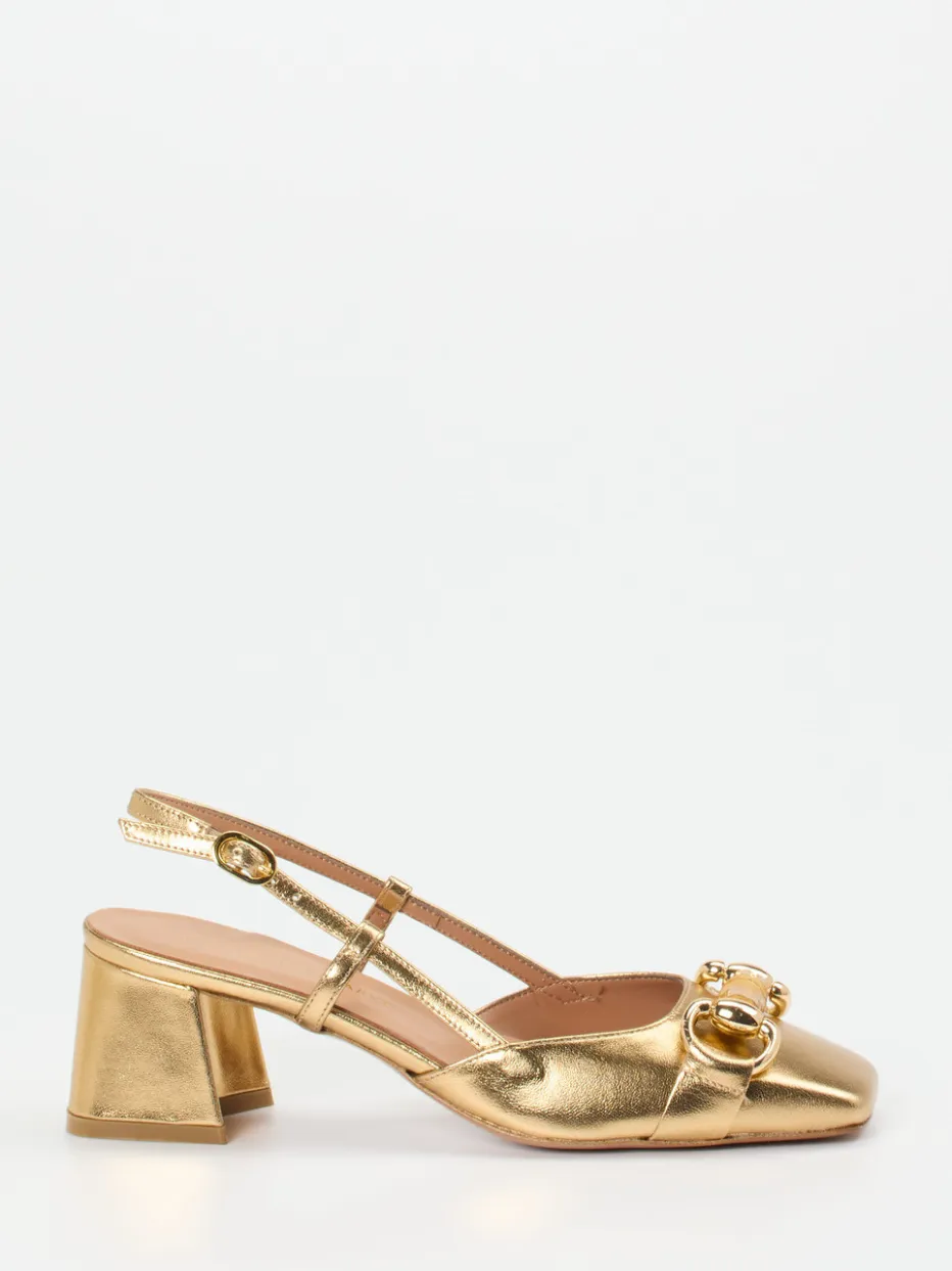 Die Slingback-Pumps in glänzendem Metallicleder verbinden Vintage-Eleganz mit modernen Details wie der Bambus-Zierschnalle und setzen ein stilvolles Statement.