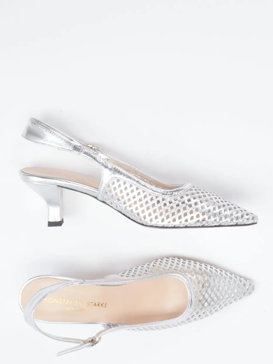 Für stilvolle Anlässe bei warmen Temperaturen konzipiert, begeistert der Slingback-Pump mit seinem metallisch glänzenden Obermaterial aus silberfarbenem Metallicleder. Die spitz zulaufende Form in Kombination mit Mesh-artigem Lochmuster wirkt feminin und raffiniert zugleich. Der Kitten Heel sowie der verstellbare Fersenriemen mit Schließe sorgen für eine komfortable Passform. Inspiriert vom Y2K-Trend und doch klar minimalistisch, passt der Look perfekt zu Party-Outfits oder eleganten Ensembles.