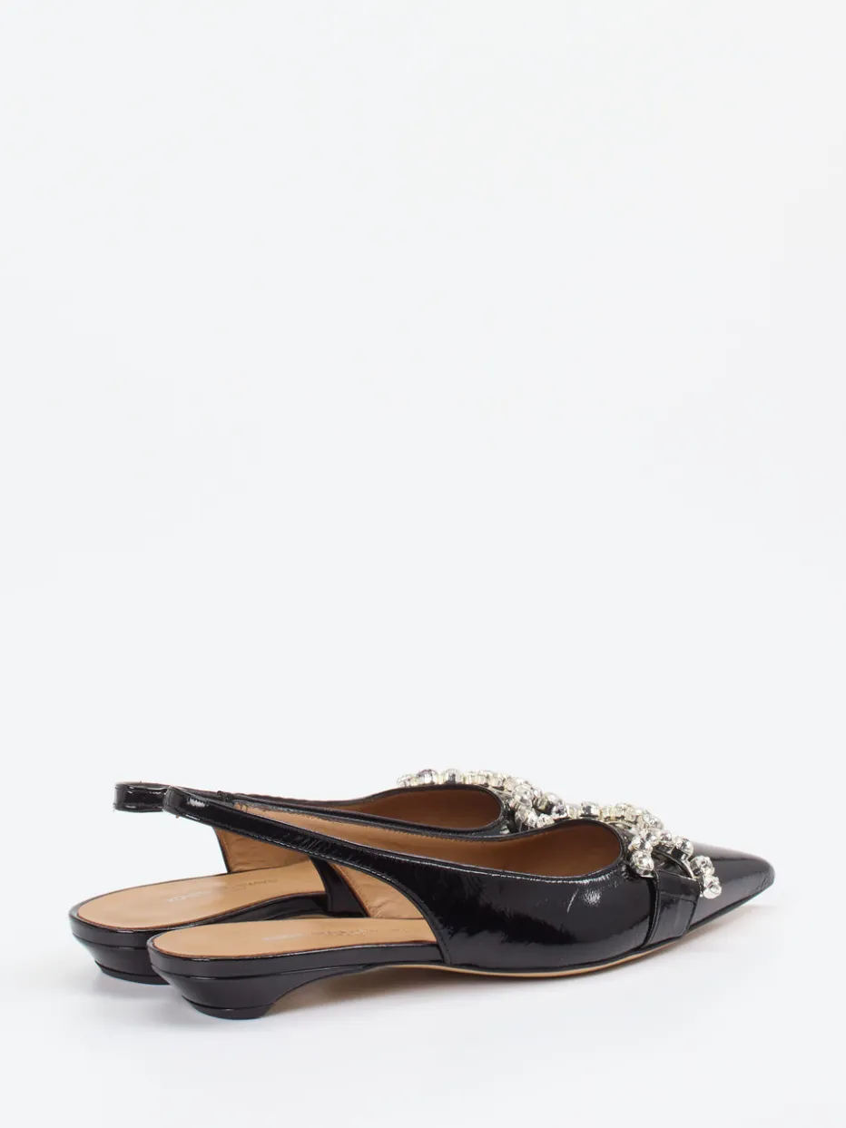 Wenn der Dresscode festlich wird, bieten diese Pumps die passende Bühne für glänzende Auftritte. Hochwertiges Lackleder in klassischem Schwarz sorgt für ein edles Finish, ergänzt durch eine funkelnde Verzierung aus Strasssteinen auf dem Vorderblatt. Die spitz zulaufende Form, ein rückseitiger Slingback-Riemen und der flache Kitten Heel unterstreichen den femininen Look. Innen sorgt feines Ziegenleder für Tragekomfort. Der Look verkörpert den Modetrend „Quiet Luxury“ mit einem Hauch 90er-Nostalgie.