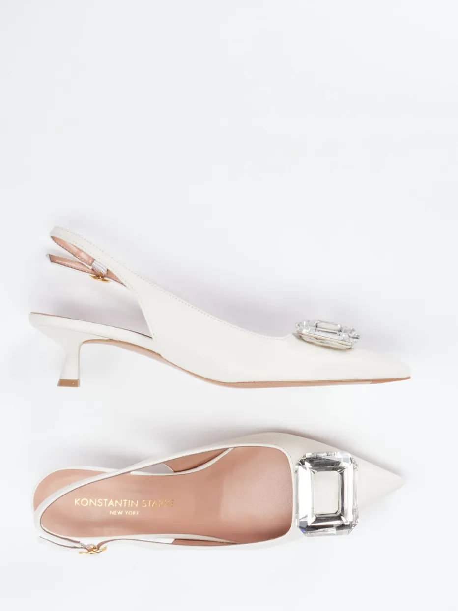 Glamourös in Szene gesetzt.Konstantin Starke überzeugt mit ausdrucksstarken Slingpumps für Damen. Für besondere Auftritte bieten diese Pumps aus cremeweißem, glänzendem Lammleder eine stilvolle Basis. Der spitz zulaufende Leisten bringt feminine Raffinesse, während der 4,5 cm hohe Kitten Heel eleganten Komfort bietet. Der Slingback-Riemen mit goldfarbener Schließe betont die Ferse formschön. Highlight ist der große, transparente Kristallstein über dem Vorderblatt – ein subtiler Blickfang im Stil von „Quiet Luxury“. Kombiniert mit einem Satinkleid oder Metallic-Clutch entsteht ein moderner Fest-Look. Designstark und zeitgemäß mit exquisiter Verarbeitungsqualität.