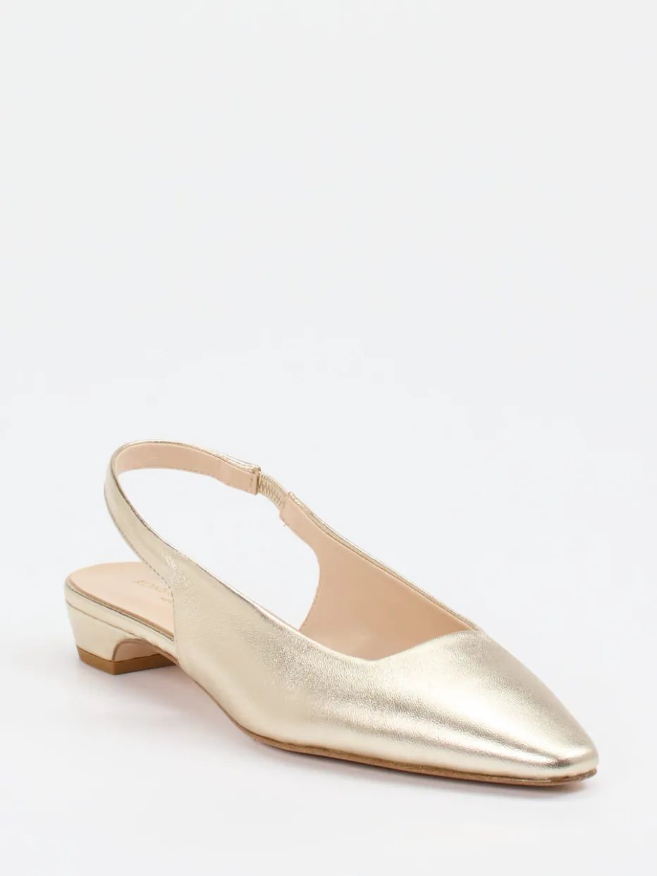 Ihr femininer Look passt ideal zu gehobenen Events oder stilvollen Sommer-Outfits. Aus hochwertigem Lammleder gefertigt, zeigt sich das Modell in einem edlen Goldton mit glänzender Oberfläche und tonalen Nähten. Die spitz zulaufende Form, der elastische Fersenriemen und der 3 cm hohe Blockabsatz sorgen für Komfort und perfekte Passform. Die gepolsterte Ledersohle unterstreicht den Anspruch an Tragequalität, während der Metallic-Look aktuelle Trends wie „Quiet Luxury“ aufnimmt. Harmoniert hervorragend mit Seidenstoffen oder filigranen Accessoires.