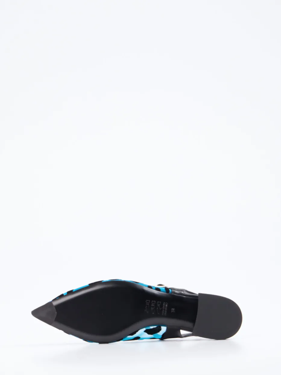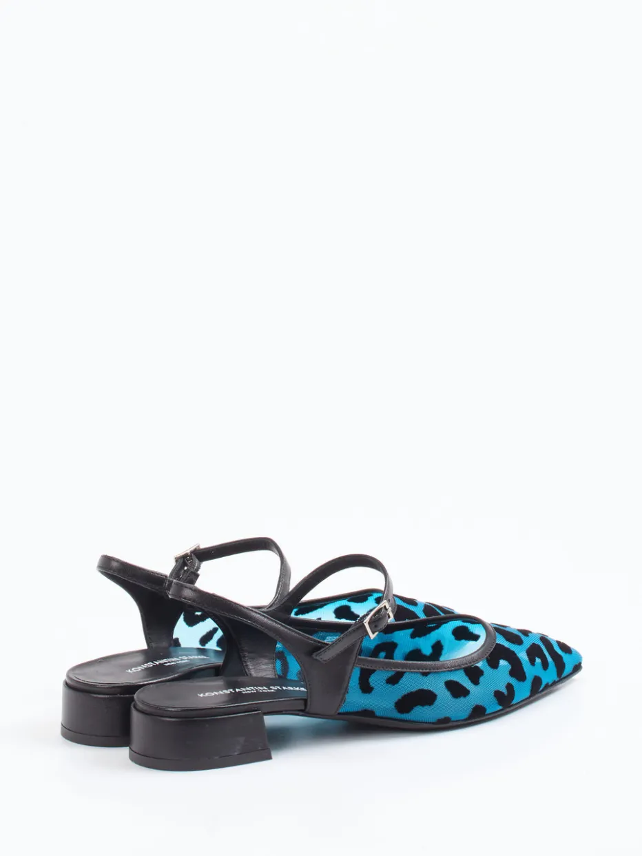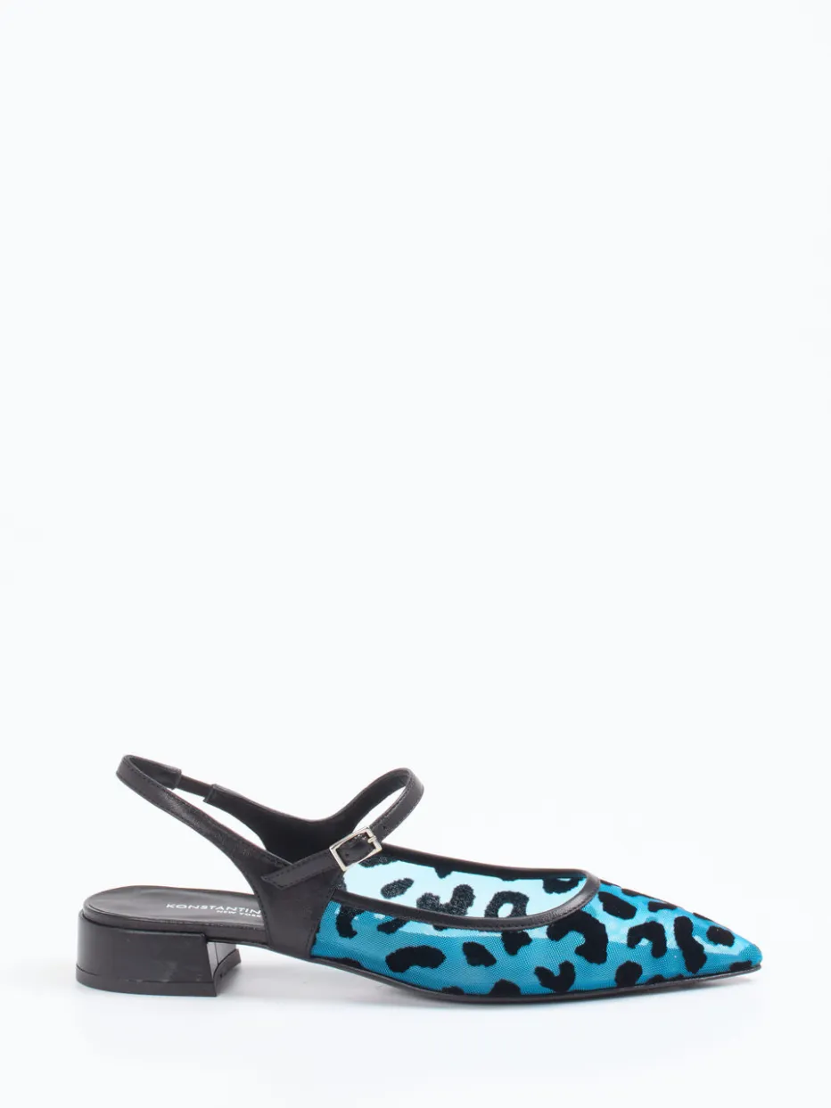 Extravaganz trifft auf sommerliche Leichtigkeit.Konstantin Starke präsentiert stilvolle Slingpumps für Damen in modernem Design. Ob zum Aperitif auf der Dachterrasse oder beim Stadtbummel mit Statement-Bag: Das transluzente Netzmaterial in Türkisblau, kombiniert mit samtig strukturierten Leoparden-Patches, erzeugt einen aufmerksamkeitsstarken Look. Der spitz zulaufende Leisten, der zarte Fersenriemen mit verstellbarer Schnalle und der zierlich unterstellte Absatz formen eine feminine Silhouette mit Streetwear-Attitüde. Silberfarbene Schnallendetails unterstreichen den Y2K-Trend, während die Ledersohle für hochwertiges Tragegefühl sorgt. Ideal zu monochromen Outfits oder glänzenden Accessoires. Hochmodische Silhouette mit charismatischem Farb- und Strukturspiel.