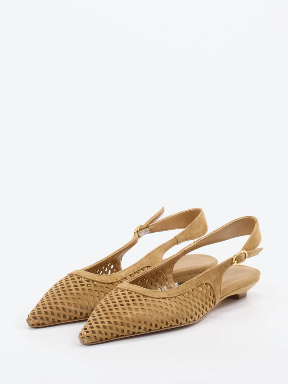 Ideal für Büro oder Freizeit, überzeugt dieses Modell durch hochwertiges Veloursleder in samtiger Flechtoptik und eine spitz zulaufende Silhouette in warmem Braunton. Die verstellbare, goldfarbene Schnalle am Fersenriemen sorgt für optimalen Halt, während die dezente Ledersohle mit gummierter Spitze komfortables Gehen garantiert. Dank luftiger Lochstruktur eignet sich der Schuh besonders für warme Tage und passt perfekt zum Trend „Quiet Luxury“. Kombinierbar mit hellen Naturtönen wie Leinen.