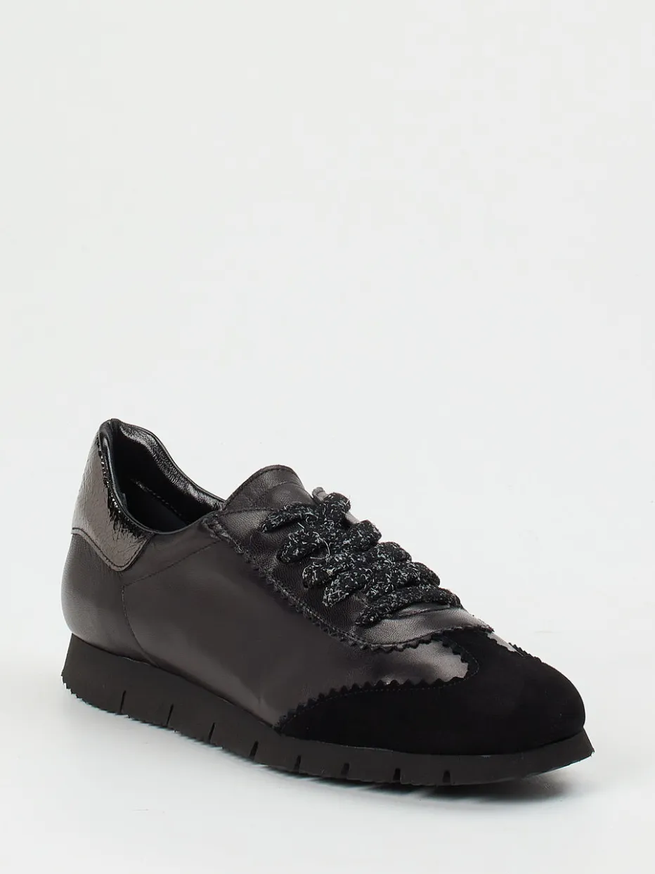 Dieser Sneaker vereint edles Lammleder mit modischen Glitzerakzenten und einer hochglänzenden Reptilprägung – ein stilvoller Blickfang für urbane Looks.