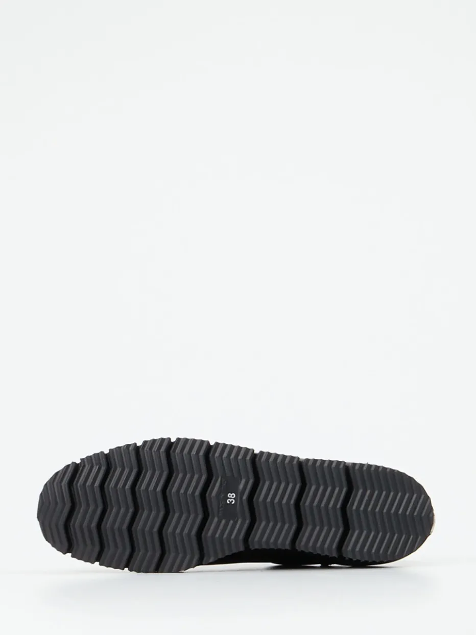 Glanz und Struktur im Streetstyle.Konstantin Starke inszeniert diesen Damen-Sneaker mit betont urbanem Anspruch. Perfekt für den Alltag oder einen stilvollen Abend mit Freund*innen: Der Low-Top besteht aus weichem schwarzem Lammleder, ergänzt durch samtiges Veloursleder und eine glänzende Metallic-Fersenkappe in Reptilprägung. Glitzerschnürsenkel und markante Ziernähte setzen modische Akzente. Die flache Silhouette wird durch eine leichte Gummisohle ergänzt, die Flexibilität und Komfort verspricht. Stilistisch bewegt sich das Modell zwischen Retro-Runner-Strömung und Streetwear-Minimalismus und lässt sich ideal zu Metallic-Accessoires kombinieren. Ein charakterstarker Fashion-Sneaker mit anspruchsvollem Materialmix und modernem Glanzmoment.
