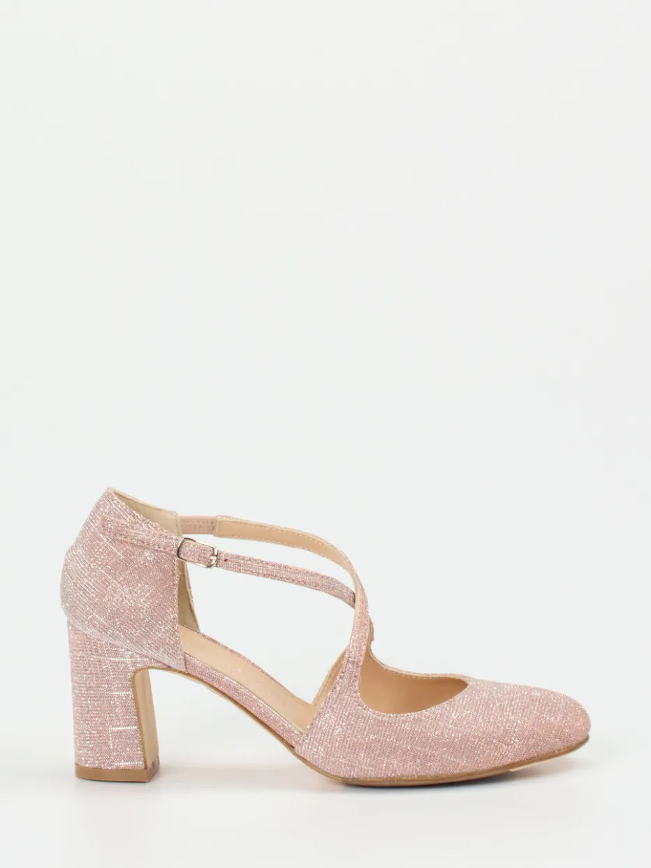 Ein femininer Mary-Jane-Pumps mit funkelnder Glitzerstruktur in Roségold und komfortabler Passform für elegante Anlässe.