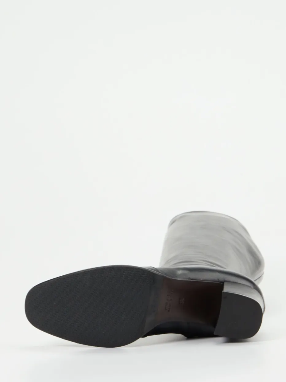 Ideal für formelle Anlässe oder urbane Business-Looks überzeugt das Modell durch seine glatte, leicht glänzende Oberfläche in edlem Schwarz. Der seitlich verdeckte Reißverschluss sorgt für eine schlanke Silhouette bei gleichzeitig hoher Alltagstauglichkeit. Ein 6 cm hoher Blockabsatz unterstreicht den femininen Charakter, während das gepolsterte Lederfußbett und das schwarze Innenfutter aus Ziegenleder für Tragekomfort sorgen. Im Look trifft minimalistischer Chic auf Retro-70s-Stil und passt zu Kaschmirmantel oder Midikleid.
