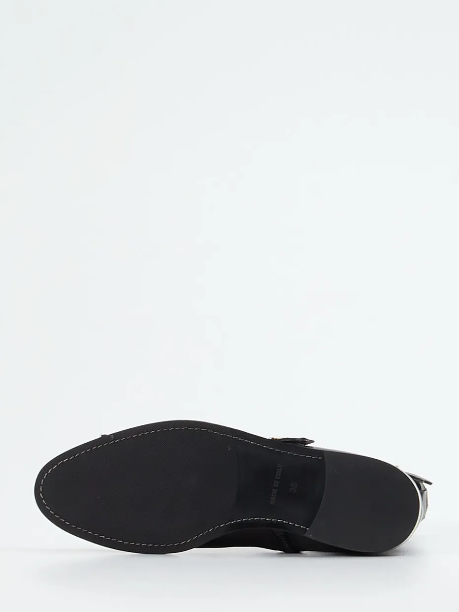 Diese Stiefelette vereint luxuriöses Kalbleder mit glänzenden Goldakzenten und einem schmalen, urbanen Design. Ein stilvolles Statement für modern-minimalistische Looks.