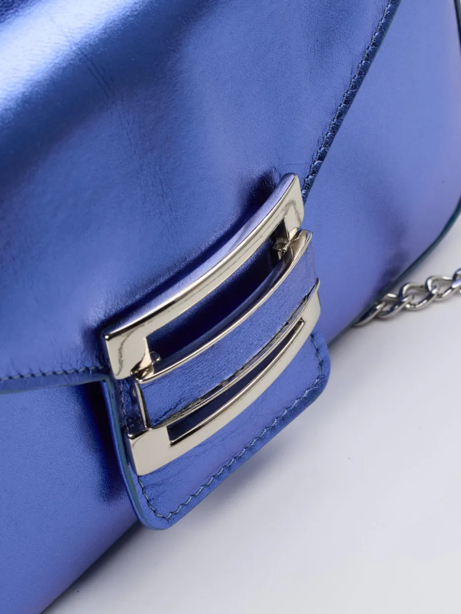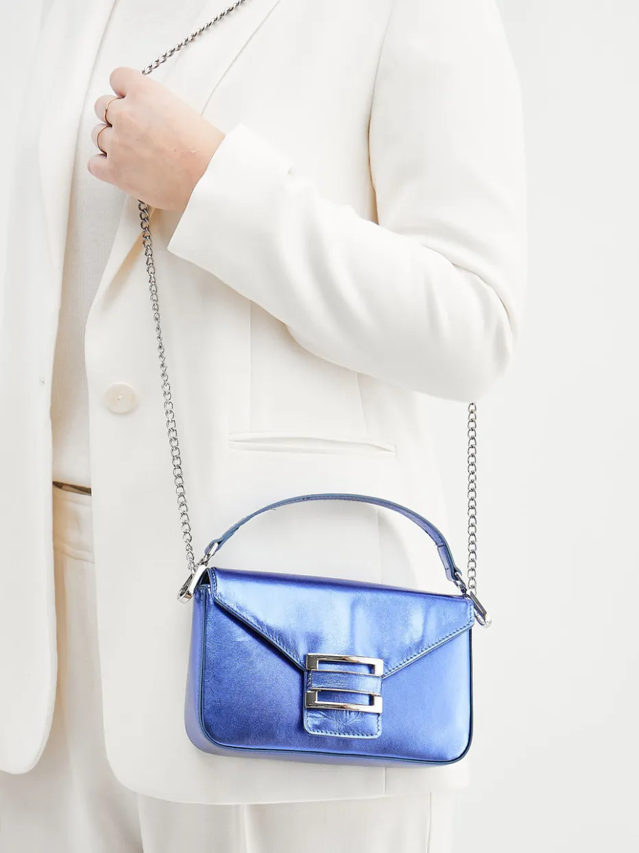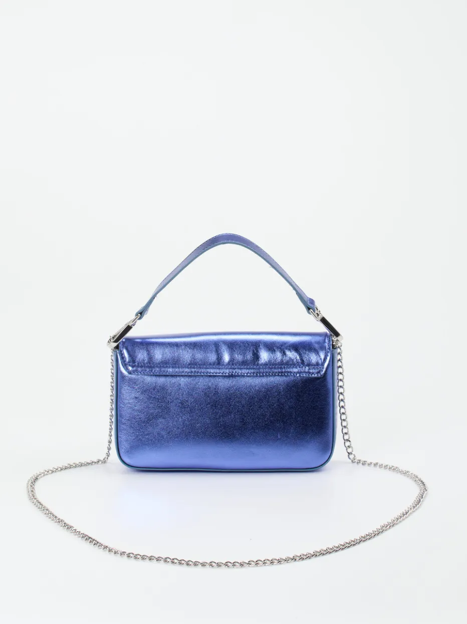 Das glänzende Metallic-Leder und silberfarbene Akzente verleihen dieser Tasche einen modernen Y2K-Twist. Form und Funktion treffen auf minimalistisch-urbanes Design.