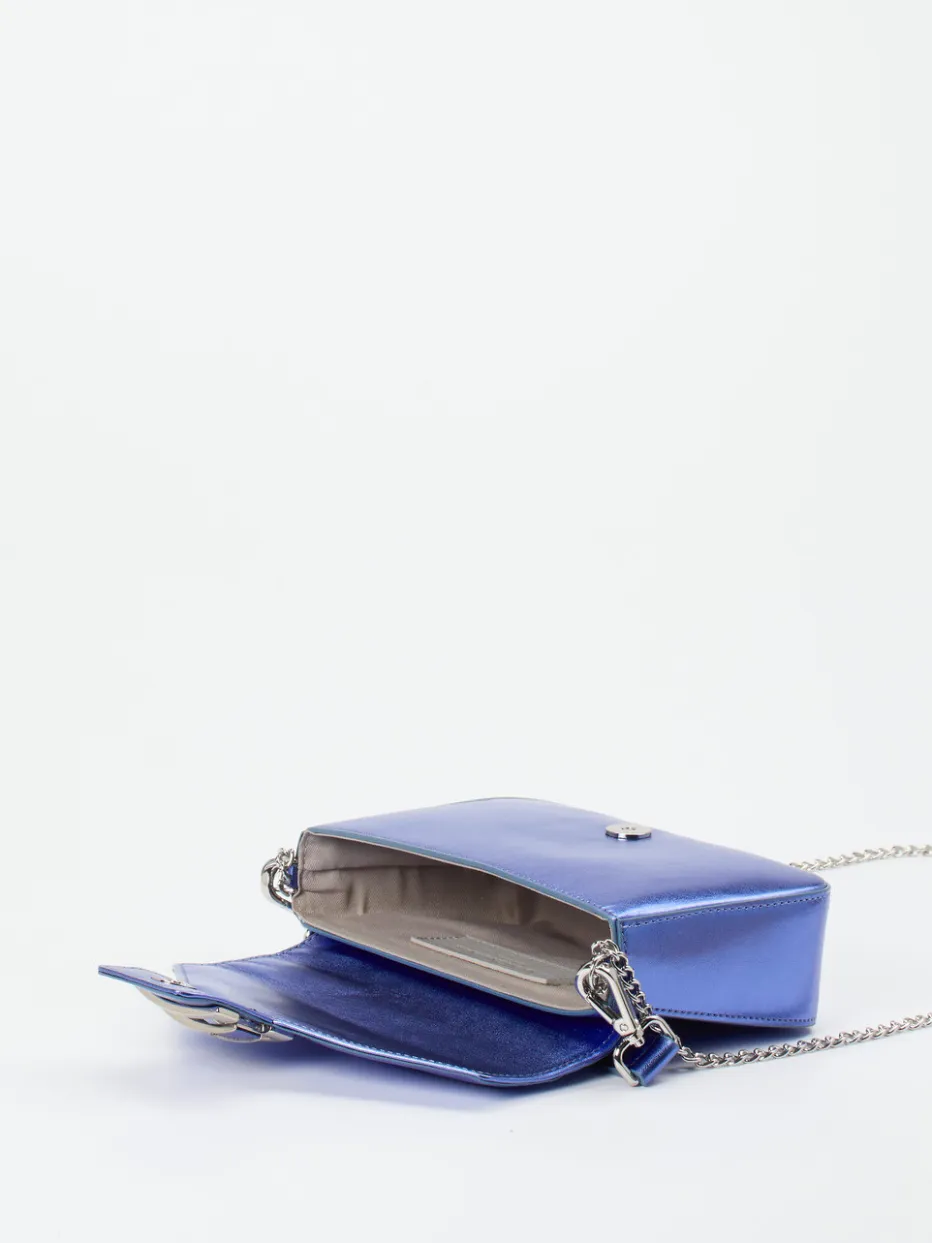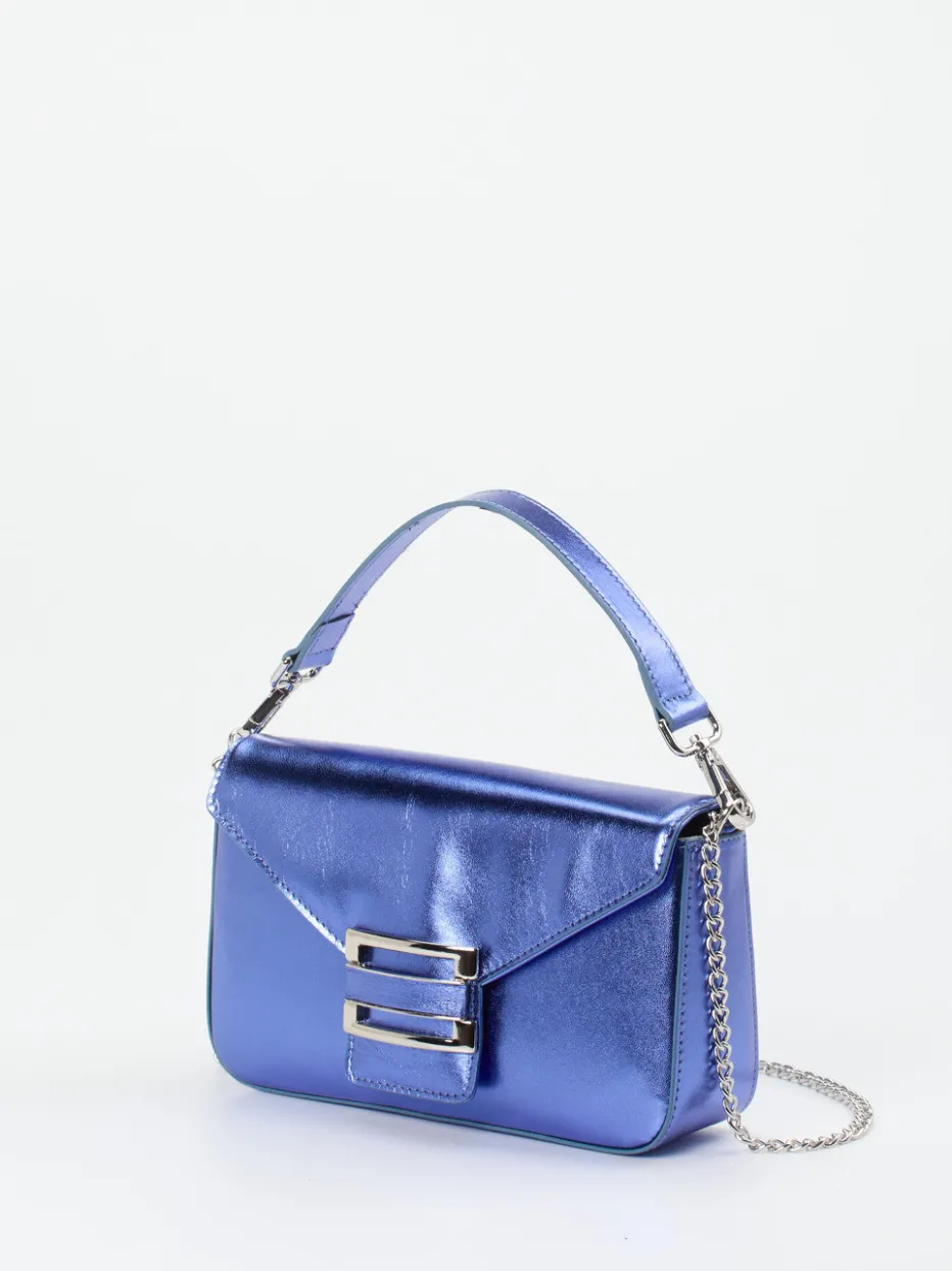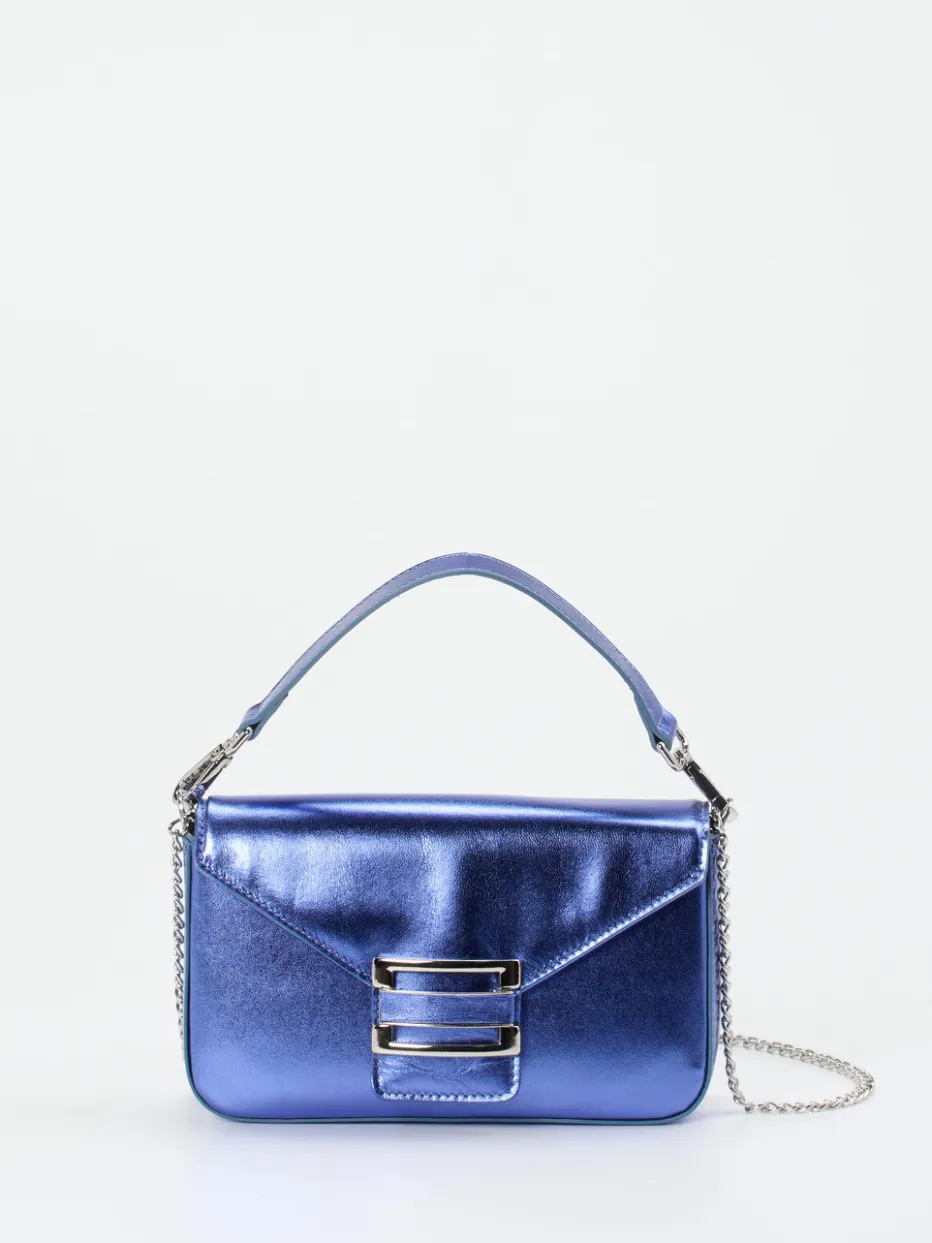 Das glänzende Metallic-Leder und silberfarbene Akzente verleihen dieser Tasche einen modernen Y2K-Twist. Form und Funktion treffen auf minimalistisch-urbanes Design.