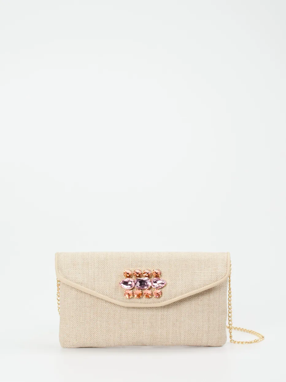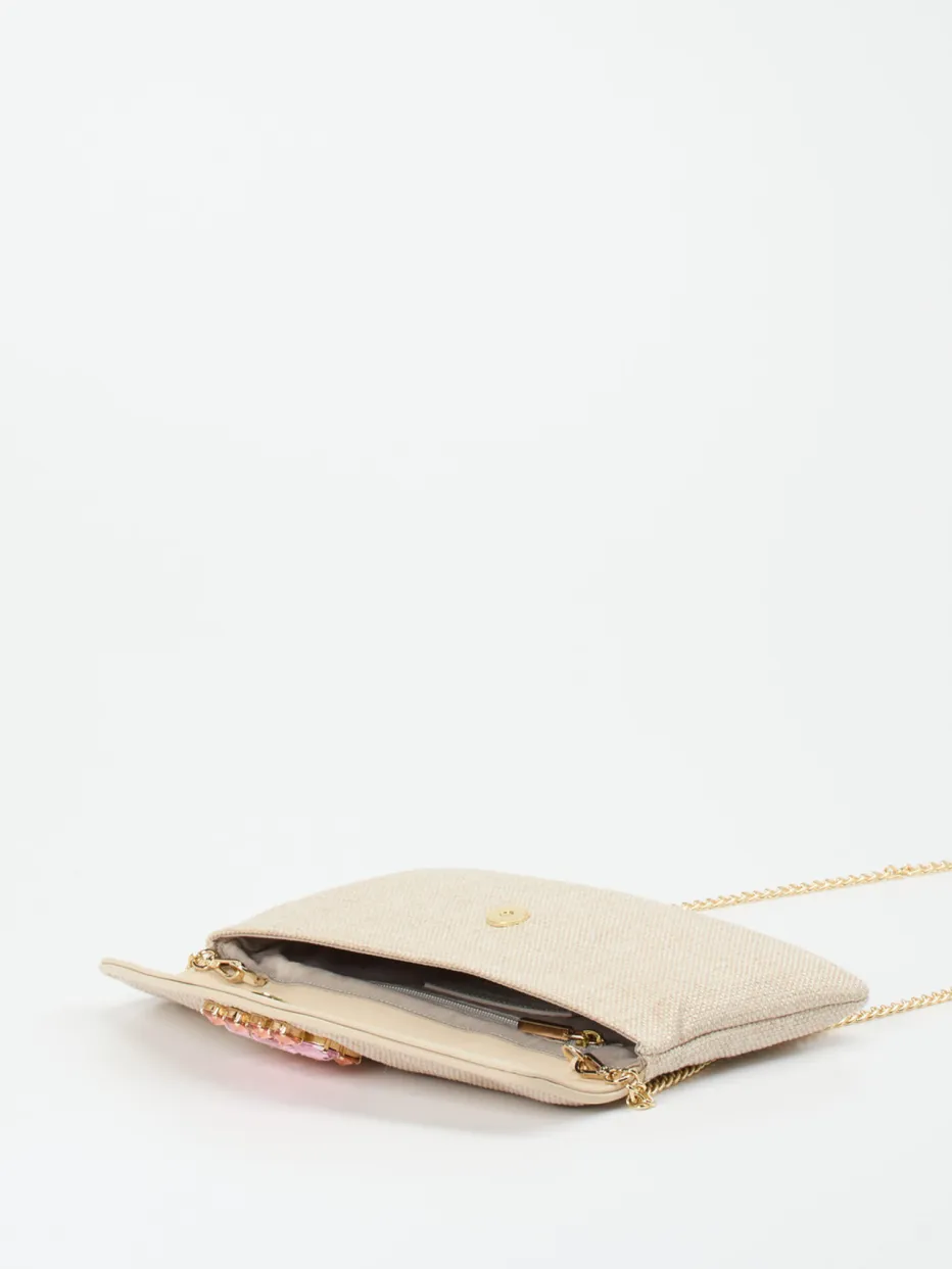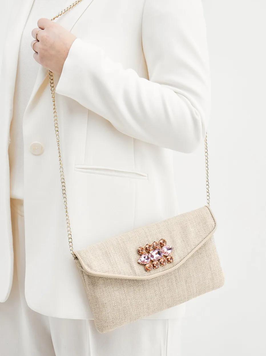 Diese Clutch kombiniert strukturiertes Textil mit zart schimmernden Schmucksteinen in Rosé- und Pfirsichtönen – elegant interpretiert im Zeichen von Quiet Luxury.