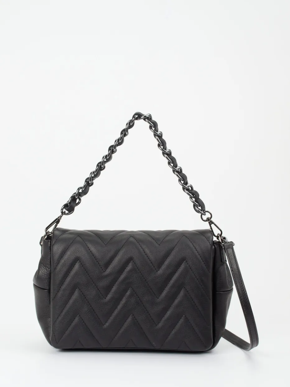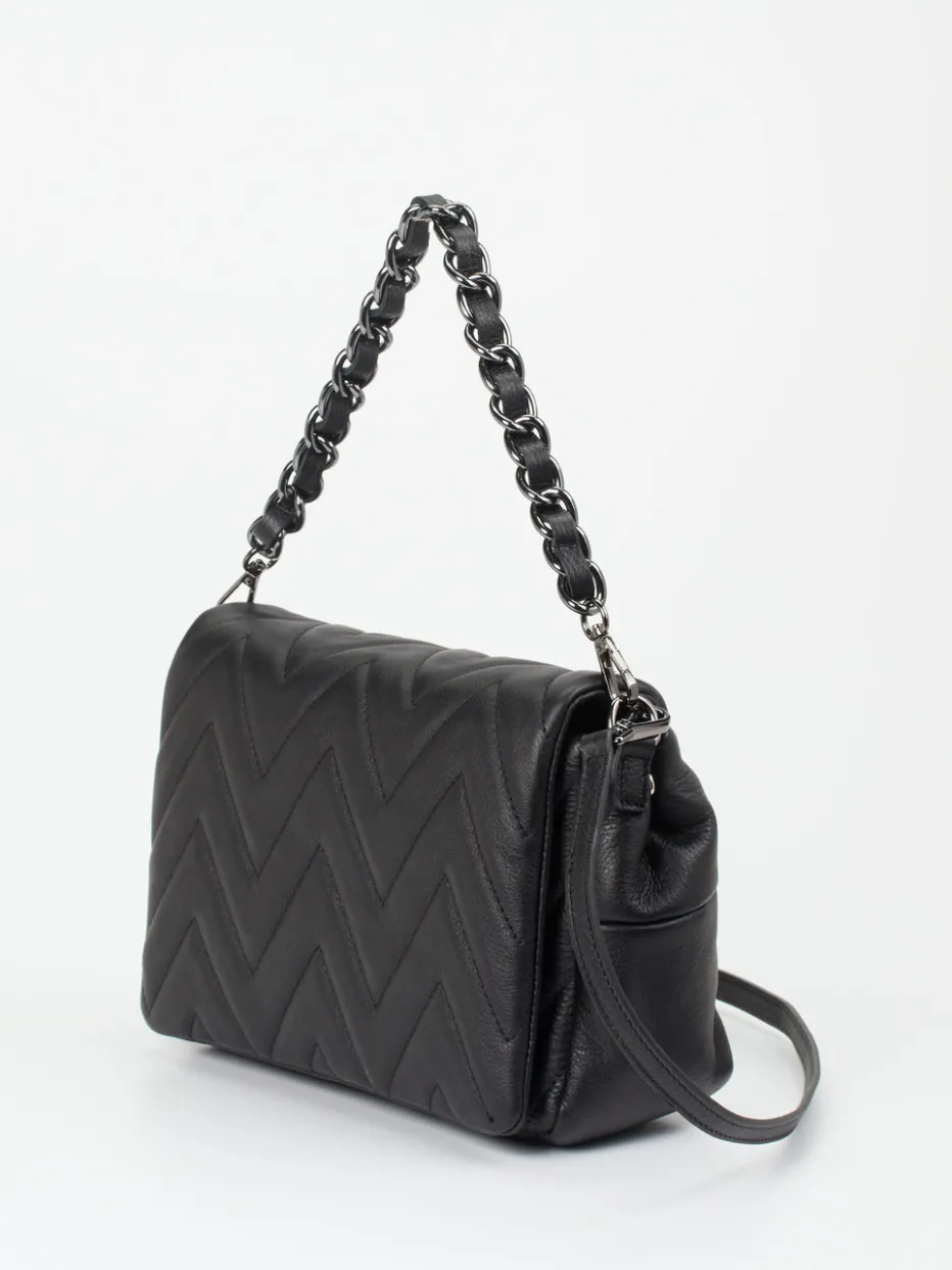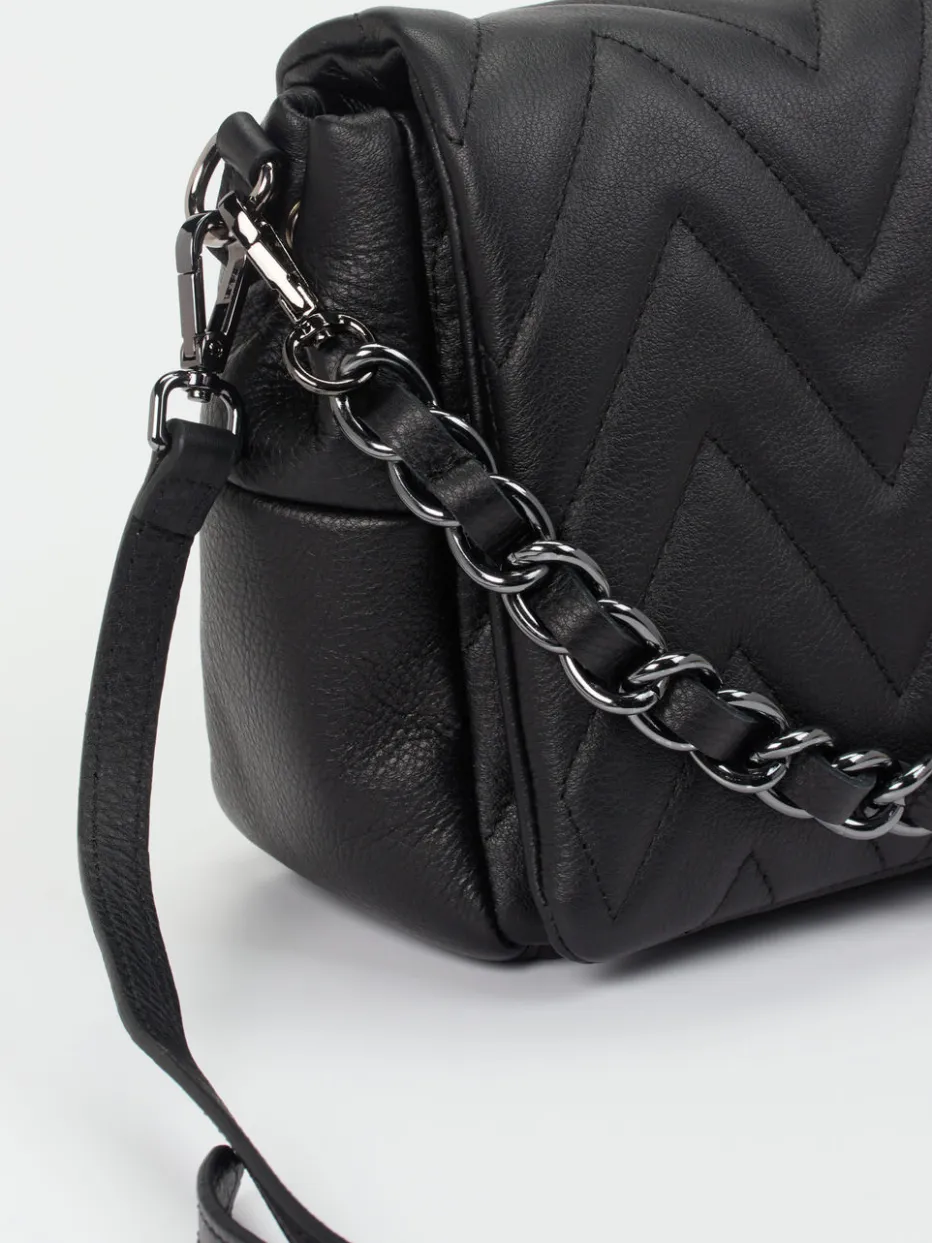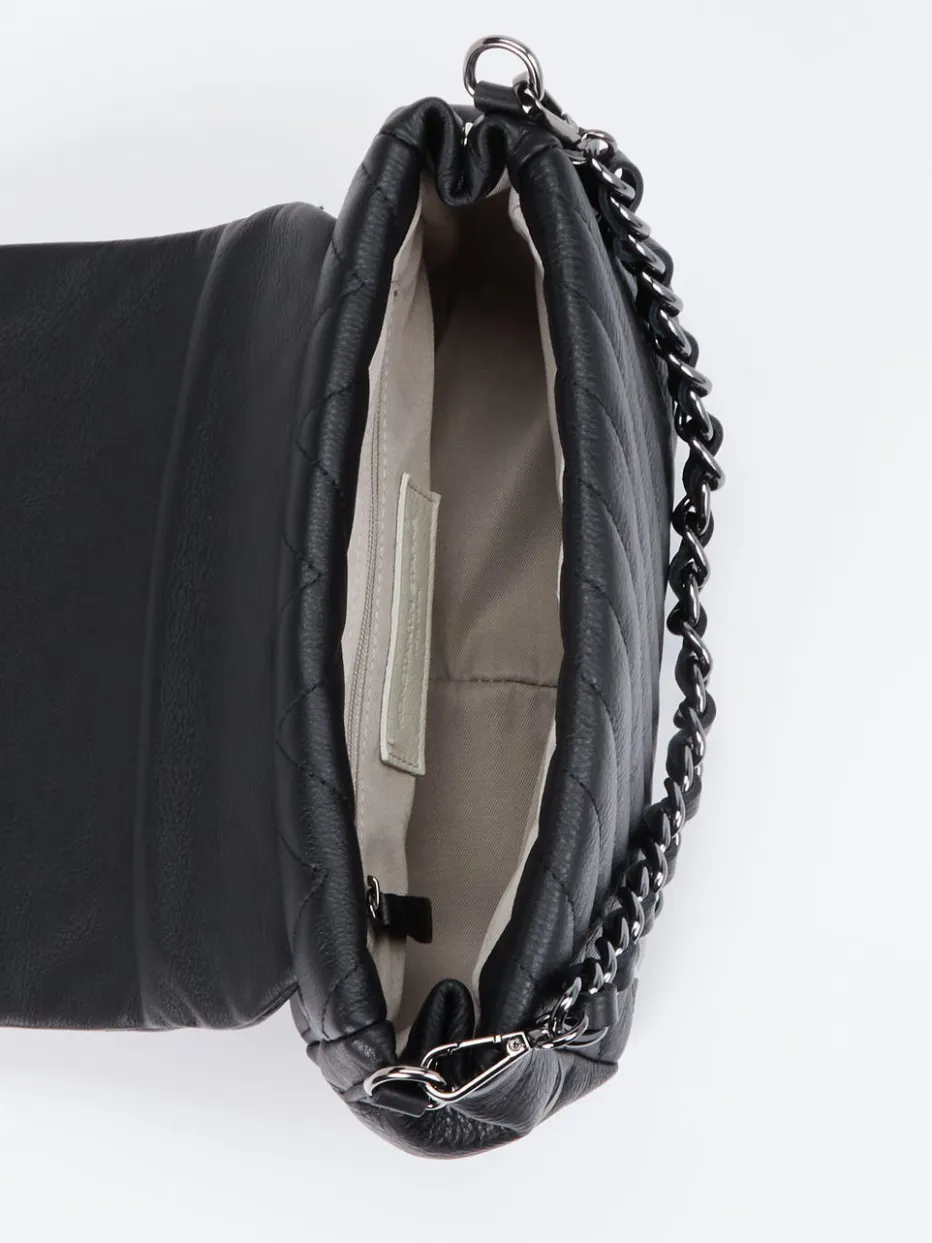 Die elegante Umhängetasche überzeugt mit hochwertigem Kalbleder, moderner Steppung und markanter Statement-Kette – ein puristisches It-Piece für anspruchsvolle Looks.