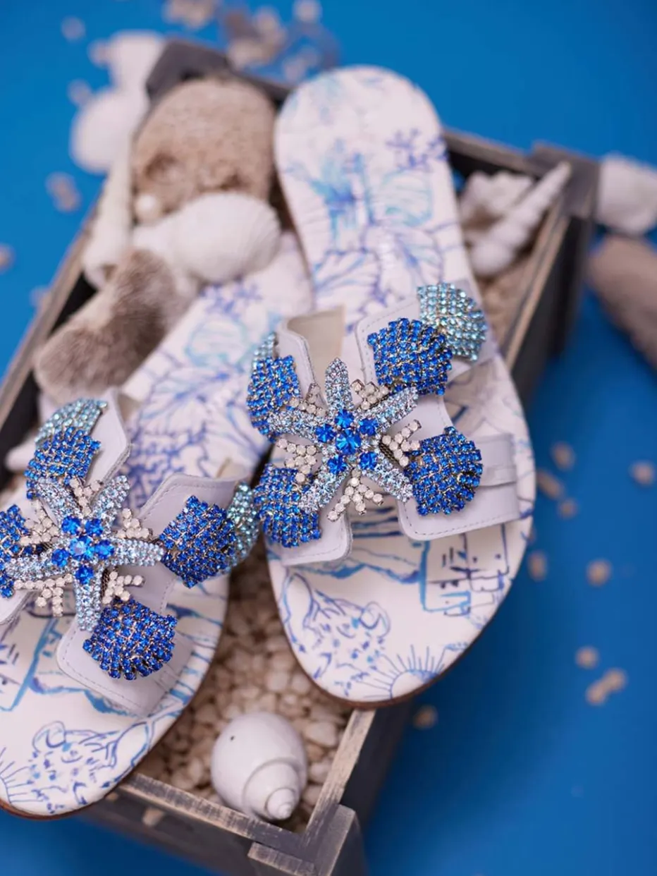 Sommerlicher Eyecatcher mit maritimen Details.Konstantin Starke interpretiert Zehensandalen auf verspielte und gleichzeitig elegante Weise. Ob am Strandboulevard oder beim Stadtbummel – das zart glänzende Lammleder sorgt für angenehmen Tragekomfort. Strassverzierte Applikationen in Muschel- und Seesternform und ein florales Muster auf der Innensohle heben das maritime Thema hervor. Die dominante Weiß-Blau-Kombination unterstreicht den frischen Resort-Charakter. Schlupfform und flache Bauweise machen das Modell ideal für warme Sommertage. Inspiriert von aktuellen Trends rund um „Urlaubs-Florals“ und „Glamour-Elemente“. Kombiniert zu fließenden Kleidern oder leichten Hosen, entfaltet der Look besondere Wirkung. Ein Zumnorde-Favorit für anspruchsvolle Designliebhaberinnen mit Sinn für Details.