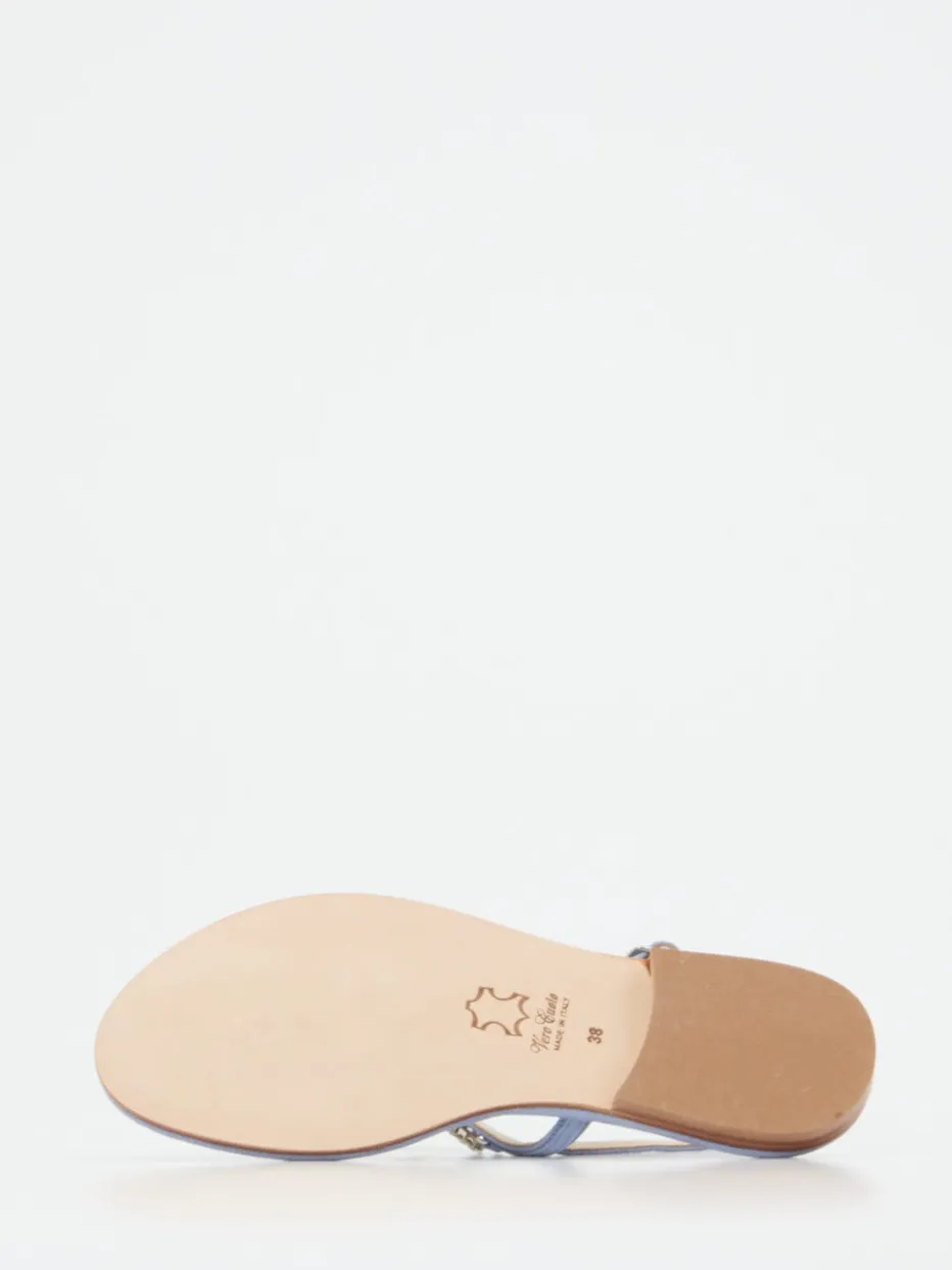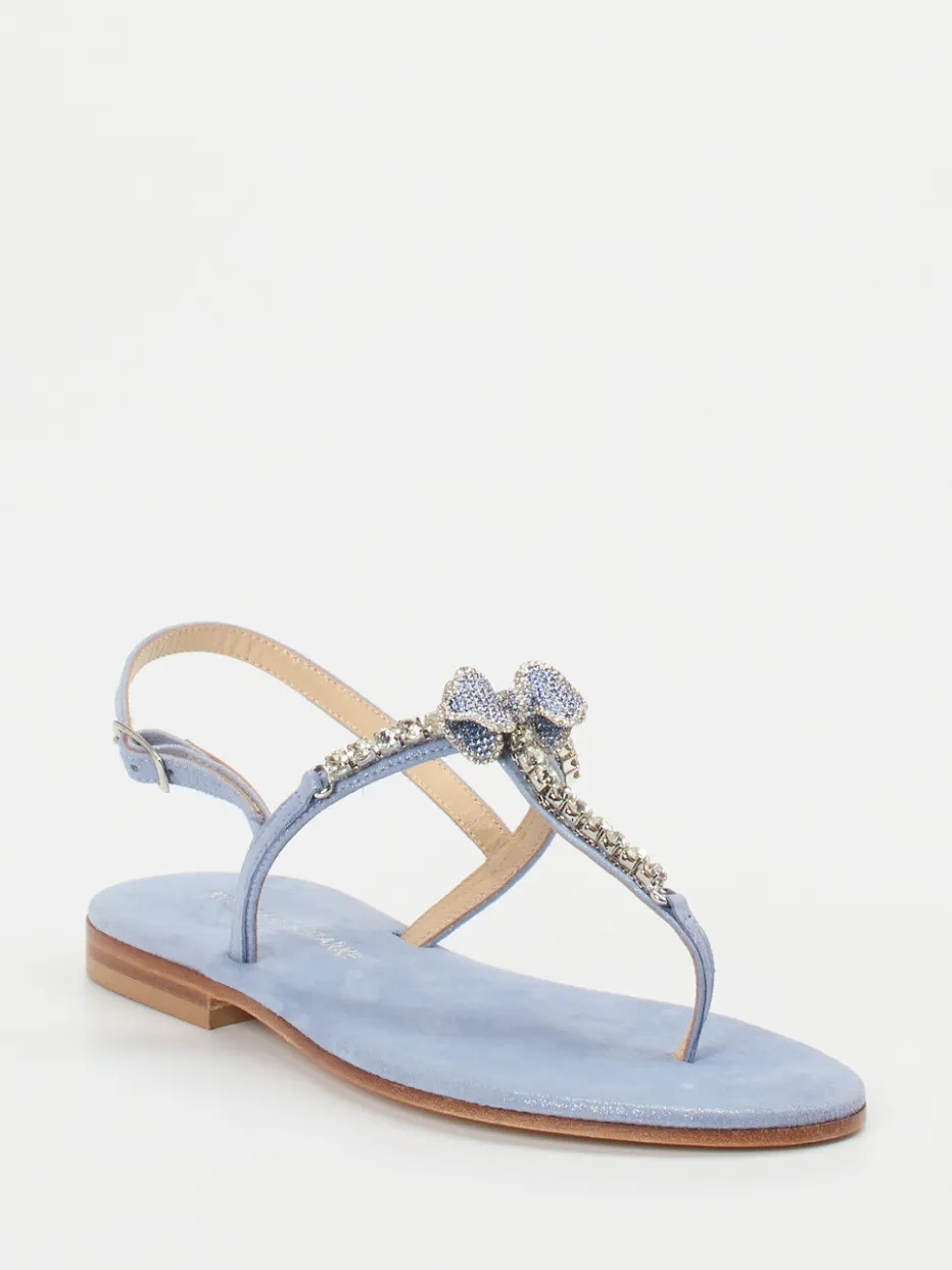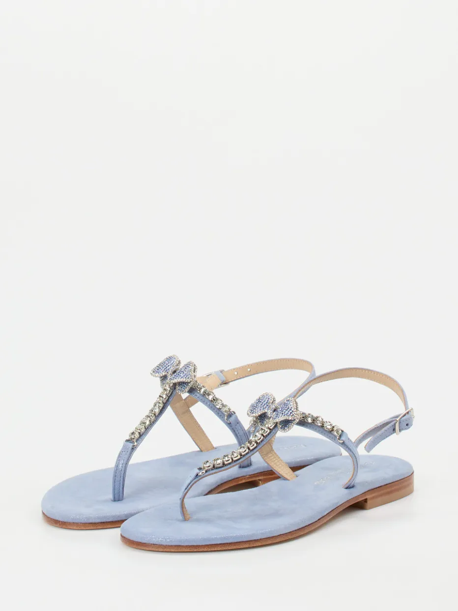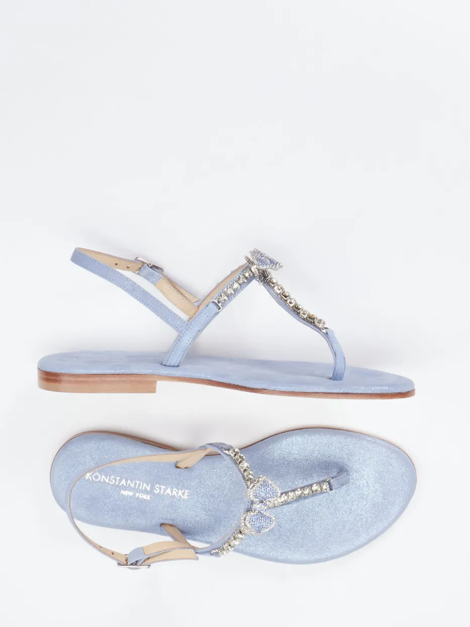 Glamouröse Leichtigkeit für sonnige Tage.Konstantin Starke bringt mit dieser Zehentrenner-Sandale einen Hauch Luxus in die warme Jahreszeit. Ob beim Strandspaziergang oder als eleganter Akzent beim Sommerdinner – das hellblaue Metallicleder mit leicht schimmernder Oberfläche trifft auf ein filigranes Design mit funkelndem Strassbesatz und zarter Schleife. Der verstellbare Fersenriemen und das weich gepolsterte Kalblederfutter sorgen für Tragekomfort, während die rutschhemmende Ledersohle zuverlässig unterstützt. Die flache Silhouette spiegelt minimalistischen Chic, akzentuiert durch Y2K-Trenddetails. Ein stilvoller Begleiter für träumerische Pastell-Looks mit femininer Note.