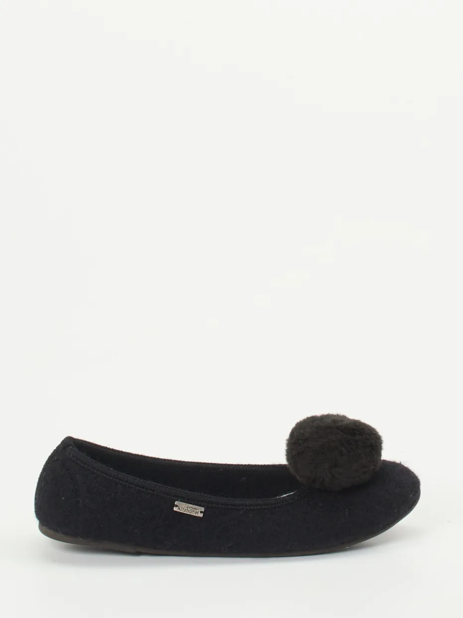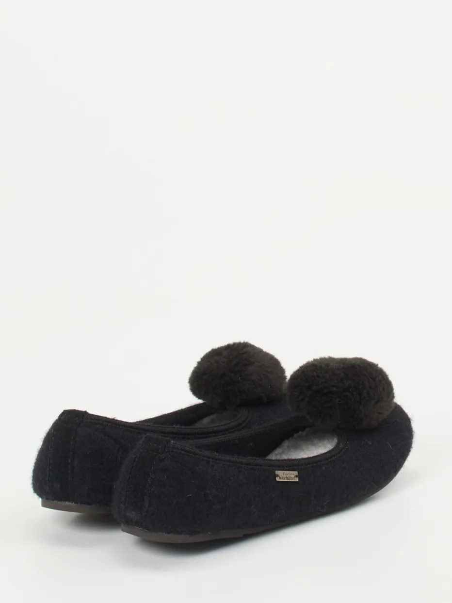 Verspielter Komfort für entspannte Tage.Living Kitzbühel präsentiert klassische Ballerina-Hausschuhe in eleganter schwarzer Ausführung. Für warme Füße an kalten Tagen sorgt das handverarbeitete Obermaterial aus Wolle mit filziger Textur und kuscheligem Kunstfellfutter. Die rund geschlossene Silhouette in Schlupfform wird von dekorativen, tonigen Pompons und einem seitlichen Metall-Label charmant begleitet. Eine leicht profilierte Gummisohle bietet rutschhemmende Stabilität beim Gehen auf glatten Böden. Stilistisch passen sie perfekt zum Cozy Comfort-Trend und lassen sich ideal mit flauschigen Hausanzügen kombinieren. Ein Qualitätsprodukt für stilvolle Entspannung mit alpinem Flair.