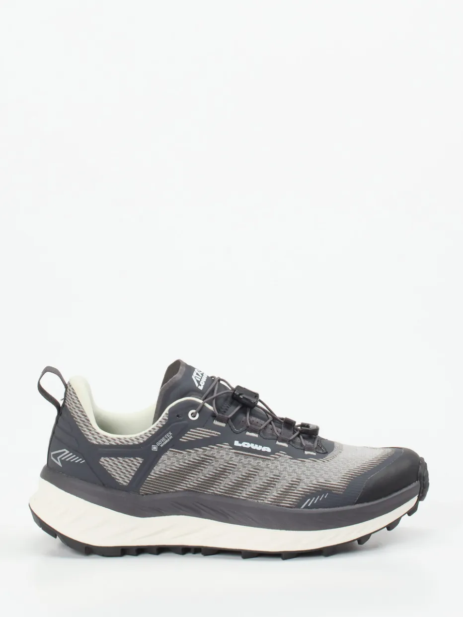 Technik trifft Komfort für das Gelände.Die Trailrunning-Schuhe von Lowa vereinen Funktion mit urbanem Stil. Konzipiert für Outdoor-Aktivitäten bei wechselhaften Bedingungen, bieten sie Stabilität auf jedem Untergrund. Das atmungsaktive Mesh mit matter Oberfläche wird durch robuste Synthetik-Overlays ergänzt; integrierte GORE-TEX-Technologie schützt dabei verlässlich vor Wind und Nässe. Die sportlich-dynamische Silhouette präsentiert sich in Anthrazitgrau mit cremeweißen Akzenten, während reflektierende Details und markante Logo-Prints die technische Optik unterstreichen. Ein praktisches Schnellschnürsystem sowie die stark profilierte Gummisohle optimieren Performance und Grip. Inspiriert vom Trend der Trail-Aesthetic passt das Design perfekt in aktuelle Gorpcore- und Athleisure-Looks. Performance-orientierte Outdoor-Ästhetik mit bewährter Lowa-Komfortkompetenz.