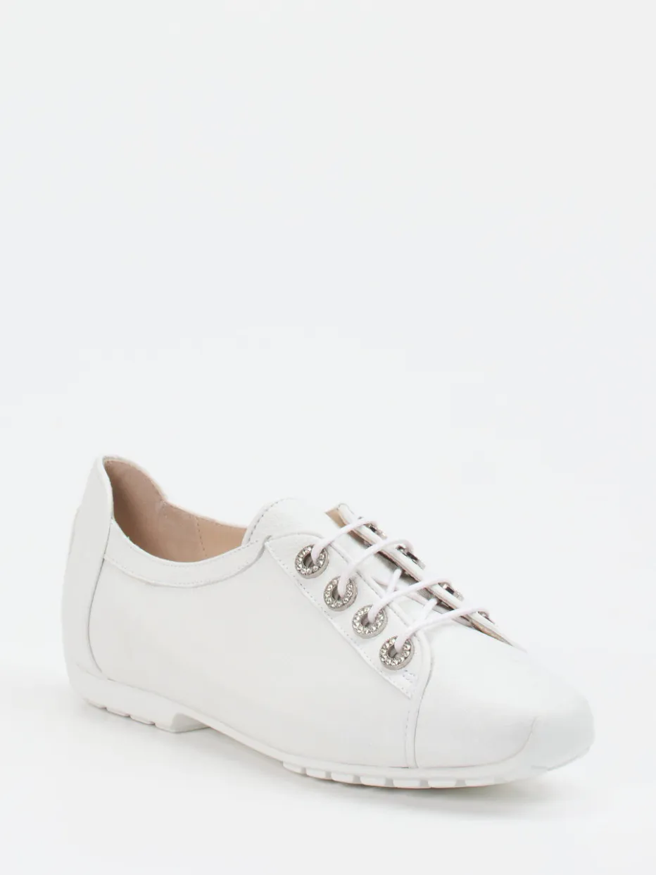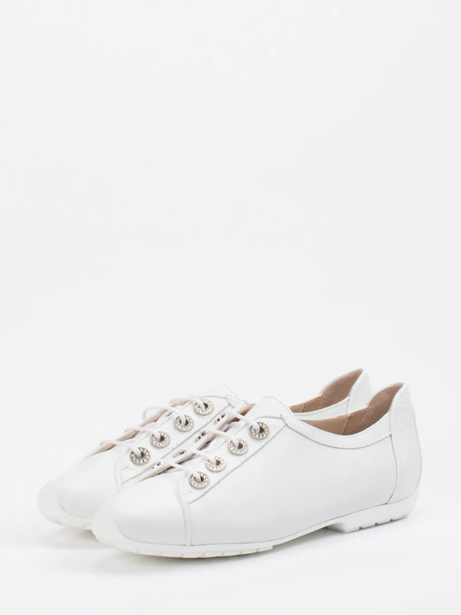 Das weiße, genarbte Lammleder verleiht dem Sneaker eine geschmeidige Haptik mit dezentem Glanz, während silberfarbene Ösen mit funkelnden Swarovski Kristallen edle Akzente setzen. Die flache, runde Form und eine flexible Gummisohle mit hochgezogener Ferse sorgen für Komfort bei täglichen Erledigungen oder entspanntem Flanieren. Schnürung und seitlicher Reißverschluss erleichtern das An- und Ausziehen. Inspiriert vom Trend „Quiet Luxury“ fügt sich das Modell harmonisch in minimalistische Looks.